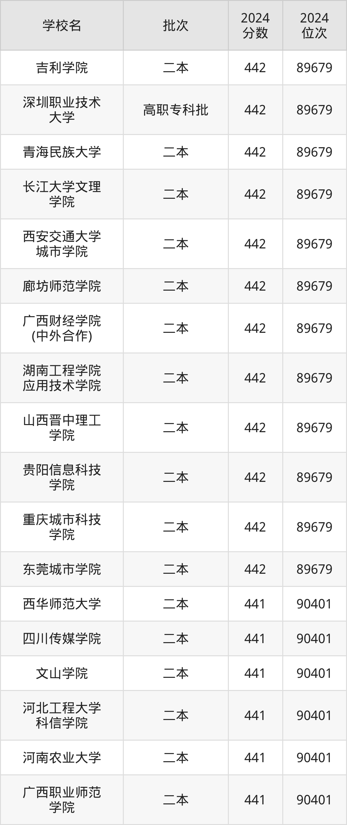 这些都是2025年高考理科89680名~90401名考生可以报考的大学,更多学校名单如下表所示: