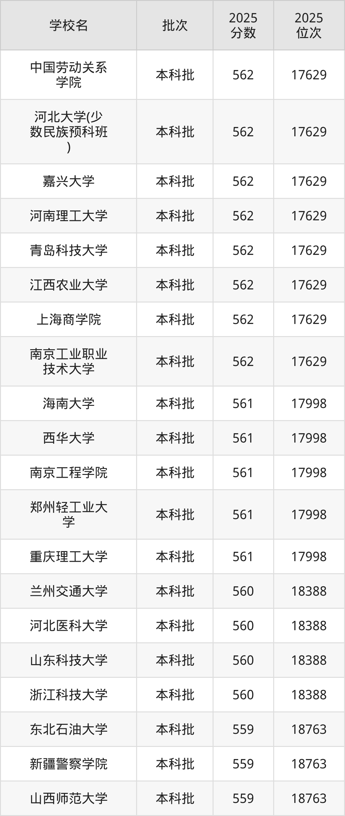 2025年河北高考历史类560分(17999名~18388名)能上的大学有山东科技大学、兰州交通大学、浙江科技大学、河北医科大学。