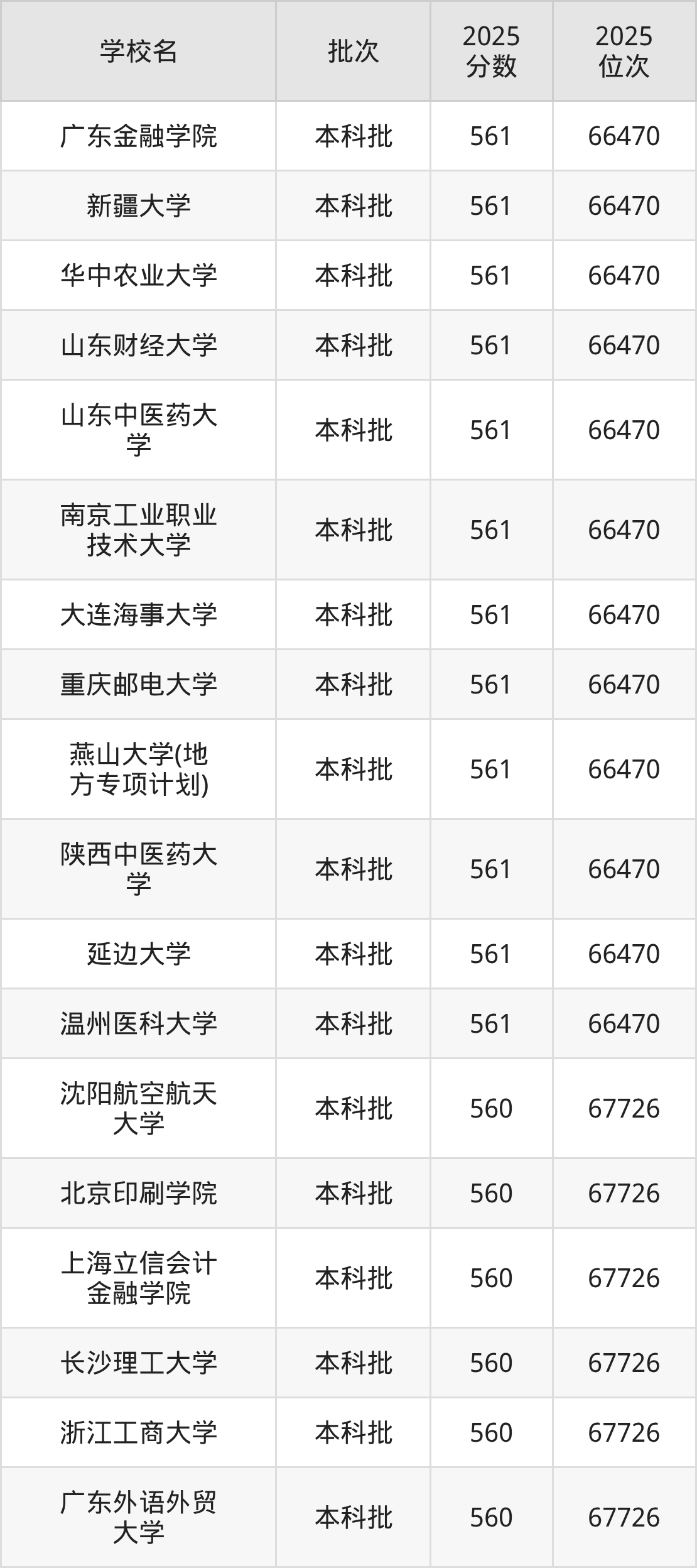 2025年河北高考物理类560分(66471名~67726名)能上的大学有广东外语外贸大学、浙江工商大学、长沙理工大学、上海立信会计金融学院等。