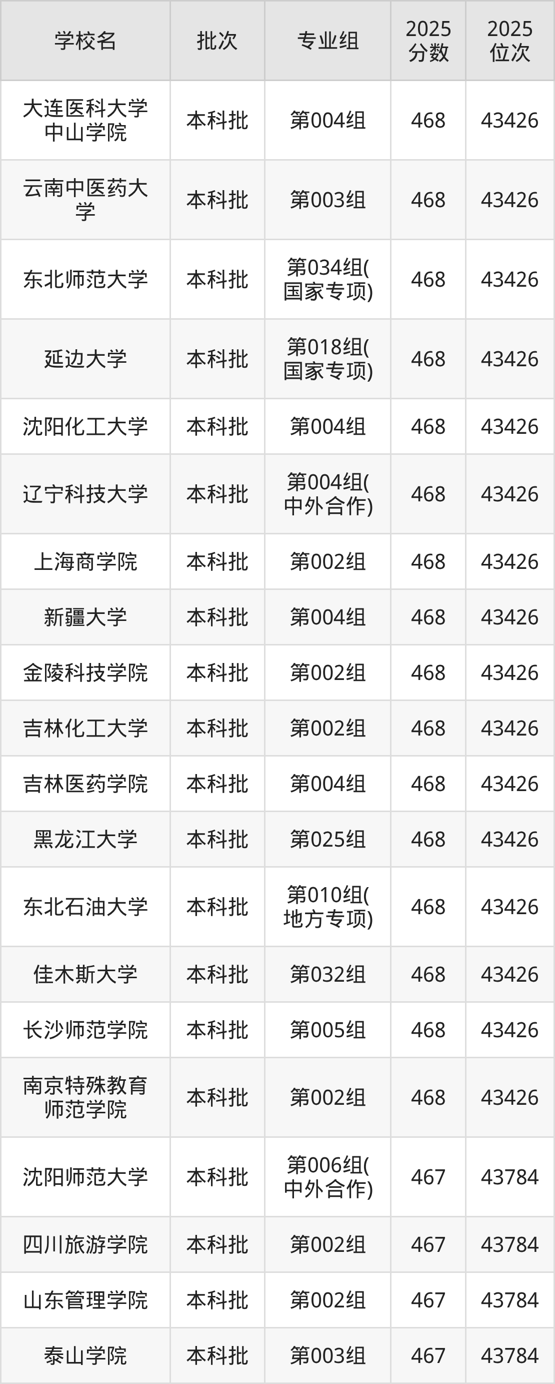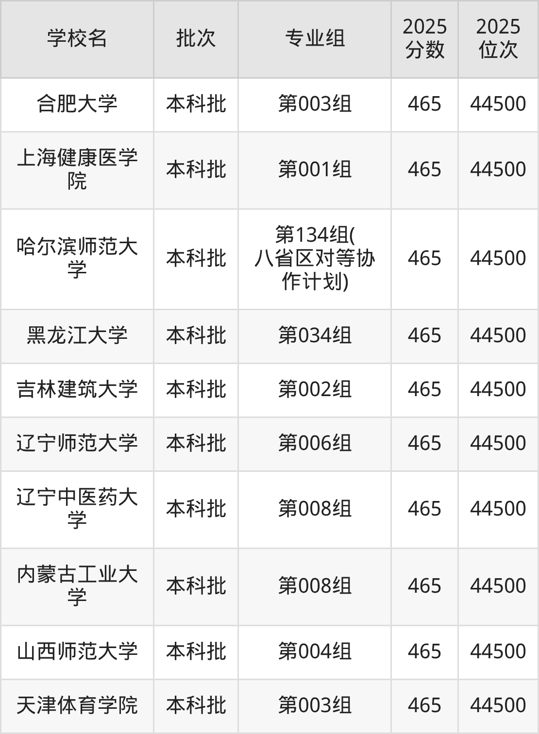 2025年黑龙江高考物理类466分(43785名~44131名)能上的大学有河北民族师范学院第002组、内蒙古工业大学第005组、淮北师范大学第004组、海南医科大学第004组等。