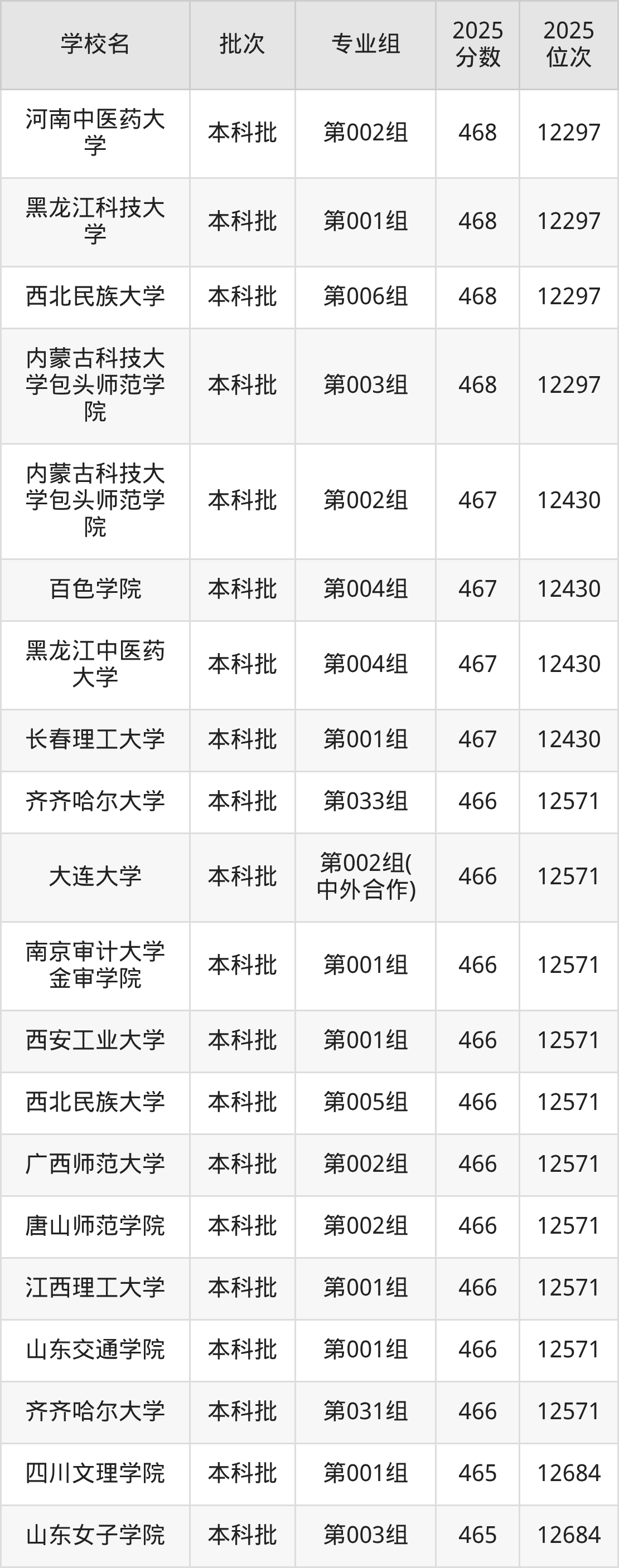 2025年黑龙江高考历史类466分(12431名~12571名)能上的大学有唐山师范学院第002组、大连大学第002组(中外合作)、齐齐哈尔大学第031组、齐齐哈尔大学第033组等。