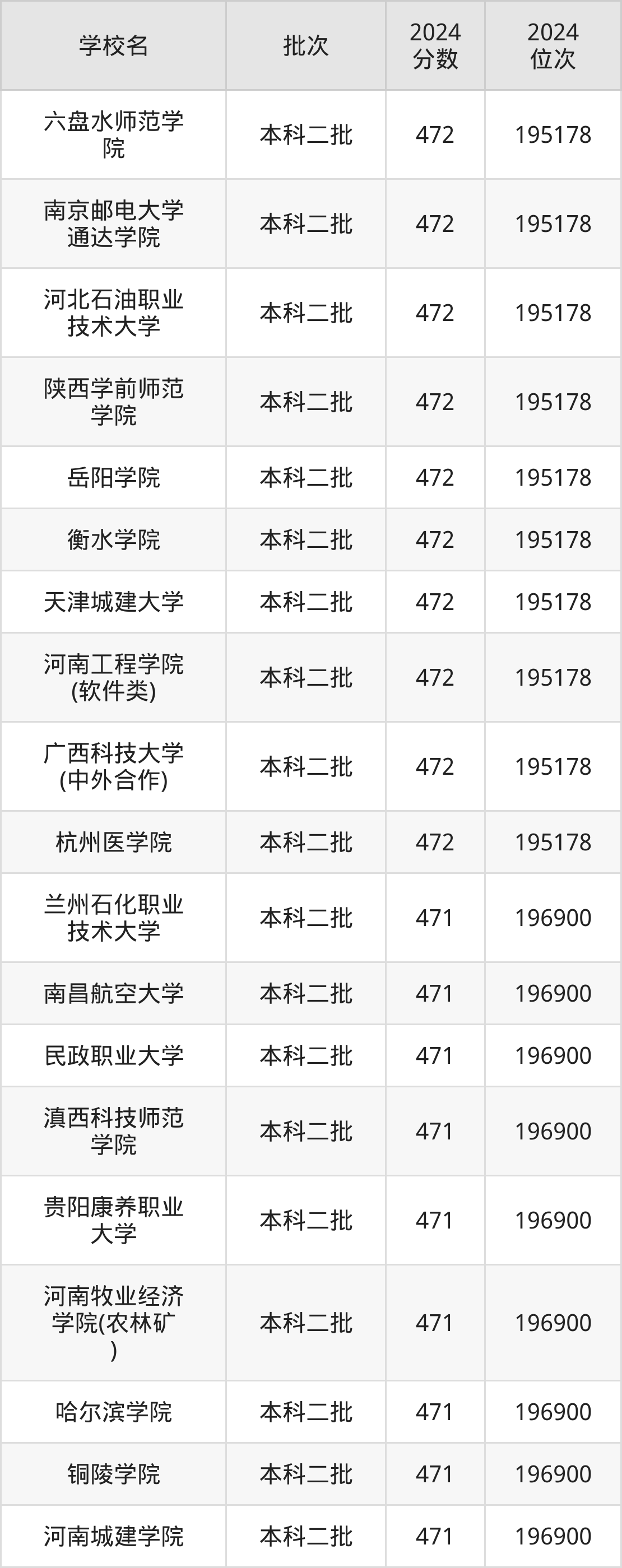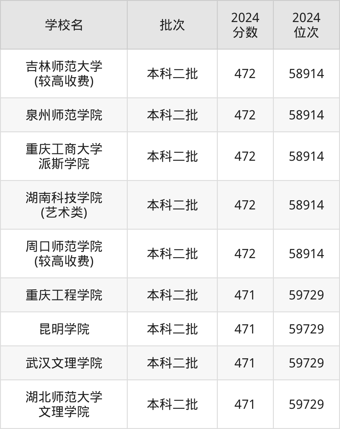 这些都是2025年高考文科58915名~59729名考生可以报考的大学,更多学校名单如下表所示: