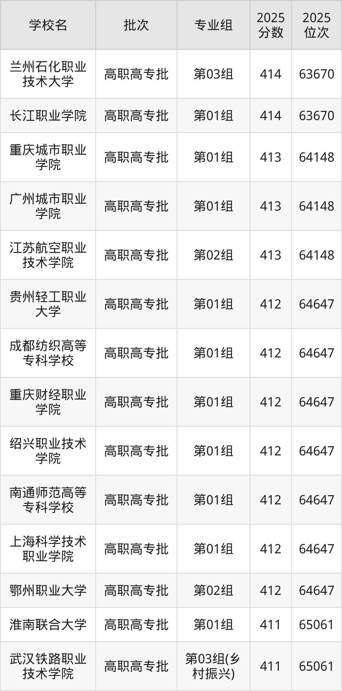 2025年湖北高考历史类412分(64149名~64647名)能上的大学有鄂州职业大学第02组、上海科学技术职业学院第01组、南通师范高等专科学校第01组、绍兴职业技术学院第01组等。