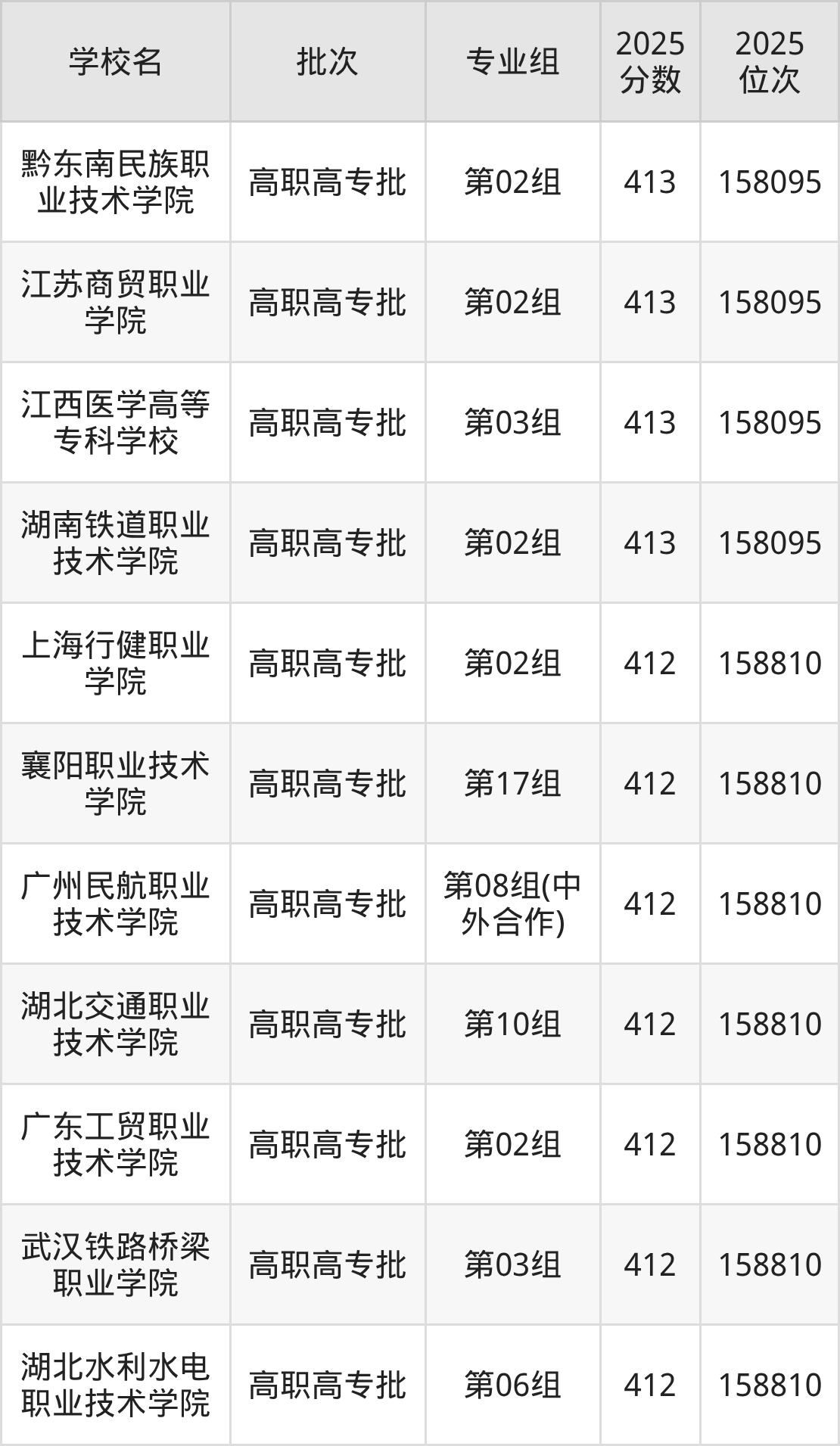 2025年湖北高考物理类412分(158096名~158810名)能上的大学有湖北交通职业技术学院第10组、襄阳职业技术学院第17组、湖北水利水电职业技术学院第06组、武汉铁路桥梁职业学院第03组等。