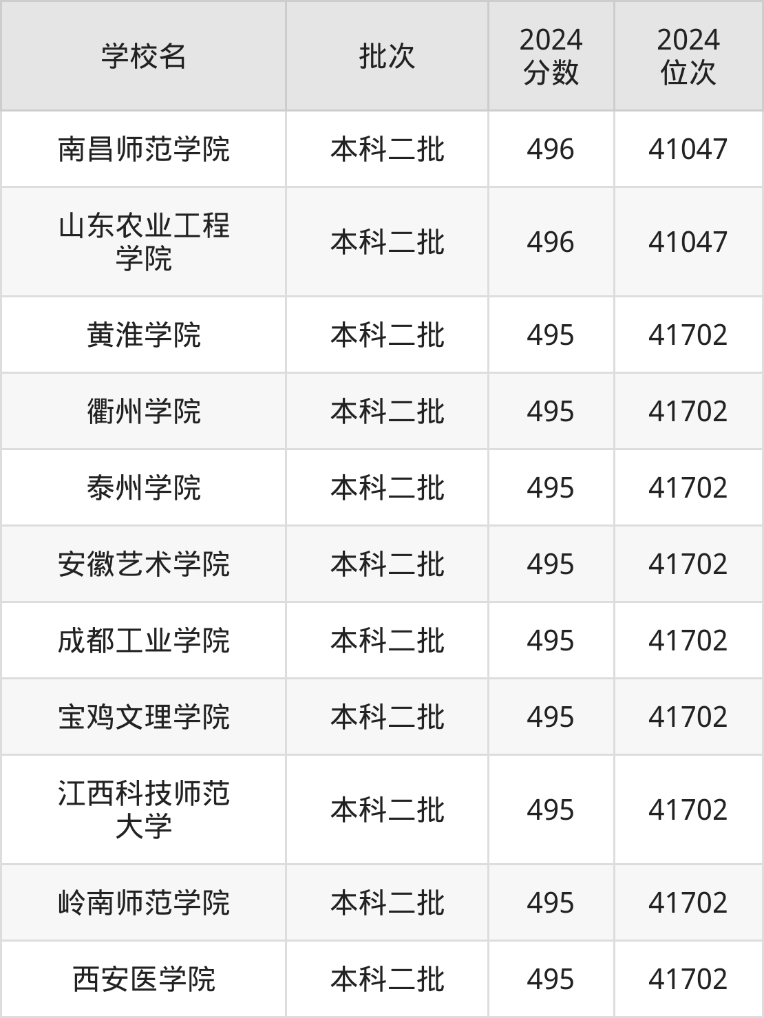 2024年河南高考文科495分(41048名~41702名)能上的大学有西安医学院、岭南师范学院、江西科技师范大学、宝鸡文理学院等。