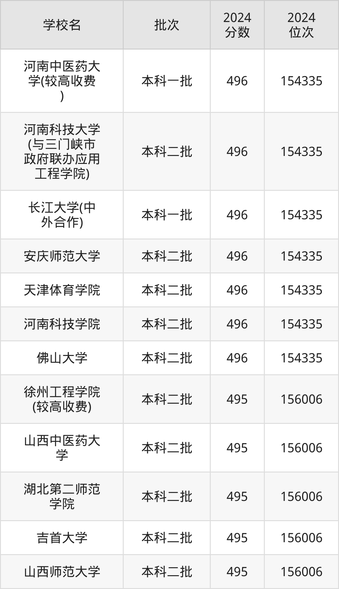 2024年河南高考理科495分(154336名~156006名)能上的大学有山西师范大学、吉首大学、湖北第二师范学院、山西中医药大学等。