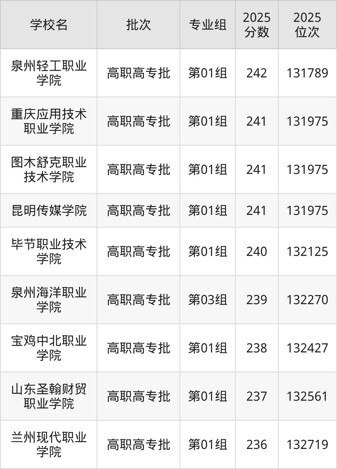 另外录取位次低于该区间(较稳妥)的有宝鸡中北职业学院第01组(132427名)、山东圣翰财贸职业学院第01组(132561名)等;录取位次高于该区间(可冲)的有毕节职业技术学院第01组(132125名)、图木舒克职业技术学院第01组(131975名)等。