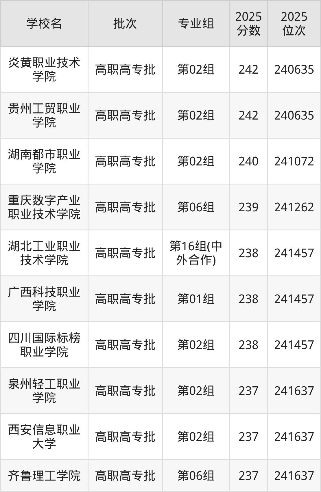 2025年湖北高考物理类239分(241073名~241262名)能上的大学有重庆数字产业职业技术学院第06组。