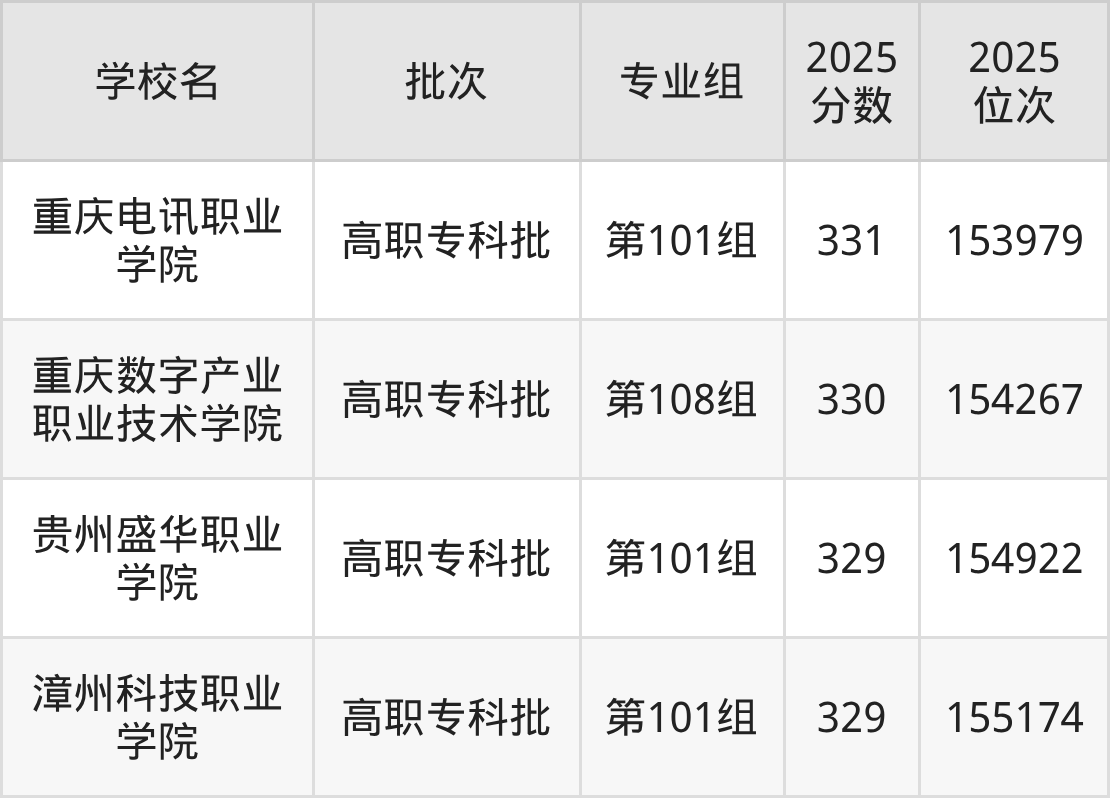 2025年江西高考历史类330分(154003名~154675名)能上的大学有重庆数字产业职业技术学院第108组。