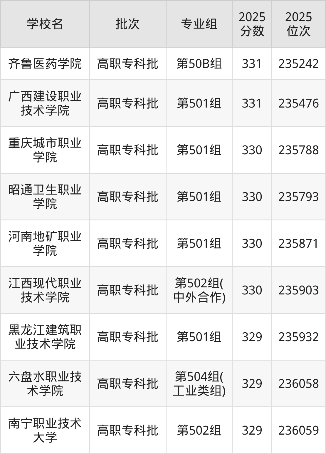2025年江西高考物理类330分(235548名~235919名)能上的大学有昭通卫生职业学院第501组、河南地矿职业学院第501组、重庆城市职业学院第501组、江西现代职业技术学院第502组(中外合作)。