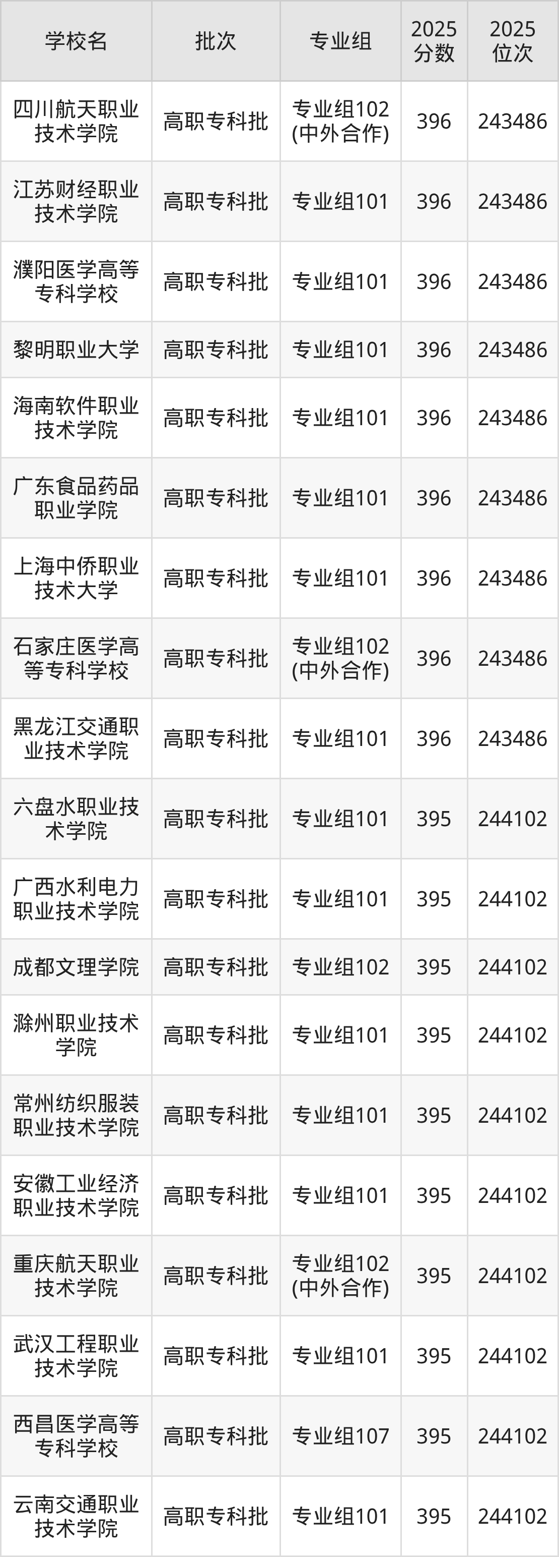 另外录取位次低于该区间(较稳妥)的有吉林司法警官职业学院专业组101(244708名)、广州科技贸易职业学院专业组102(244708名)等;录取位次高于该区间(可冲)的有濮阳医学高等专科学校专业组101(243486名)、石家庄医学高等专科学校专业组102(中外合作)(243486名)等。