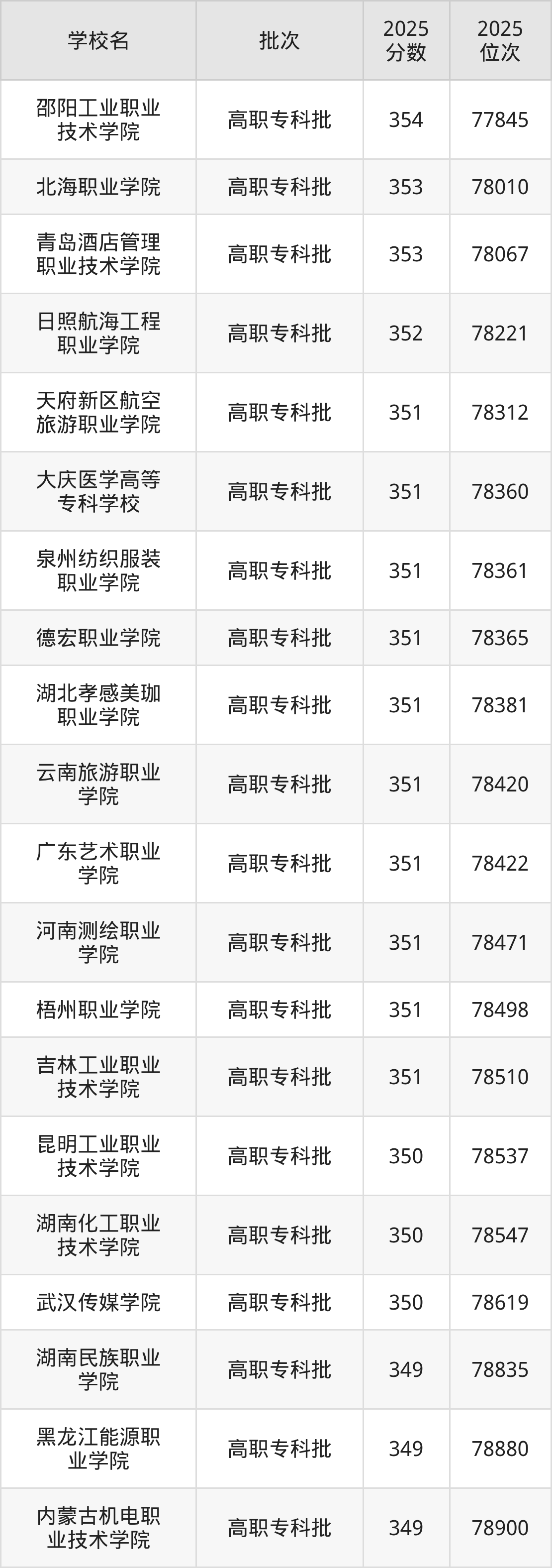 另外录取位次低于该区间(较稳妥)的有昆明工业职业技术学院(78537名)、湖南化工职业技术学院(78547名)等;录取位次高于该区间(可冲)的有日照航海工程职业学院(78221名)、青岛酒店管理职业技术学院(78067名)等。