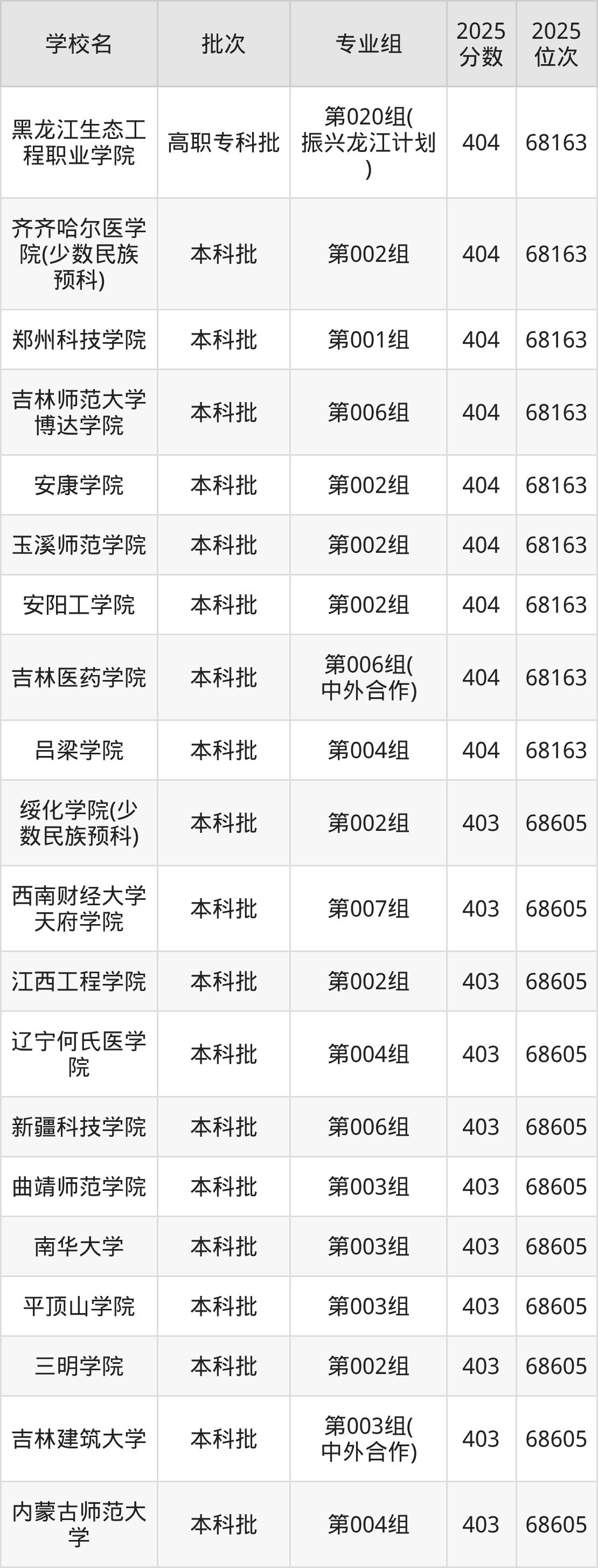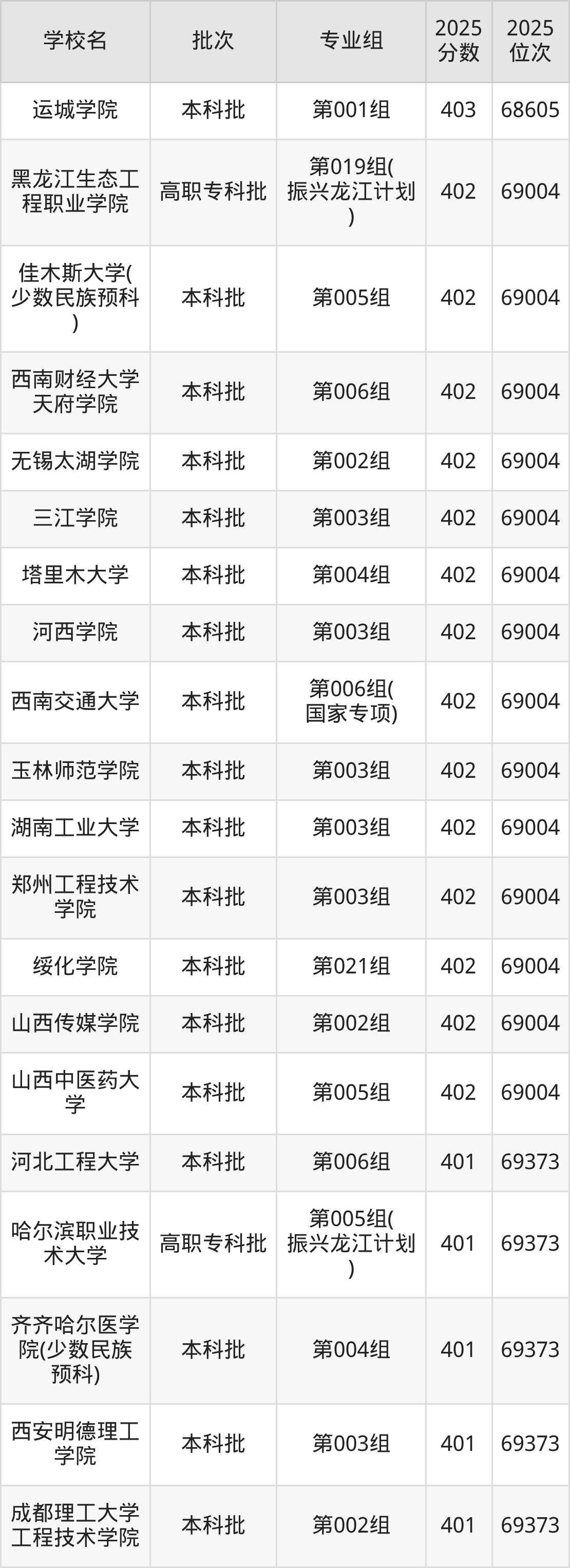 2025年黑龙江高考物理类402分(68606名~69004名)能上的大学有山西中医药大学第005组、山西传媒学院第002组、绥化学院第021组、郑州工程技术学院第003组等。