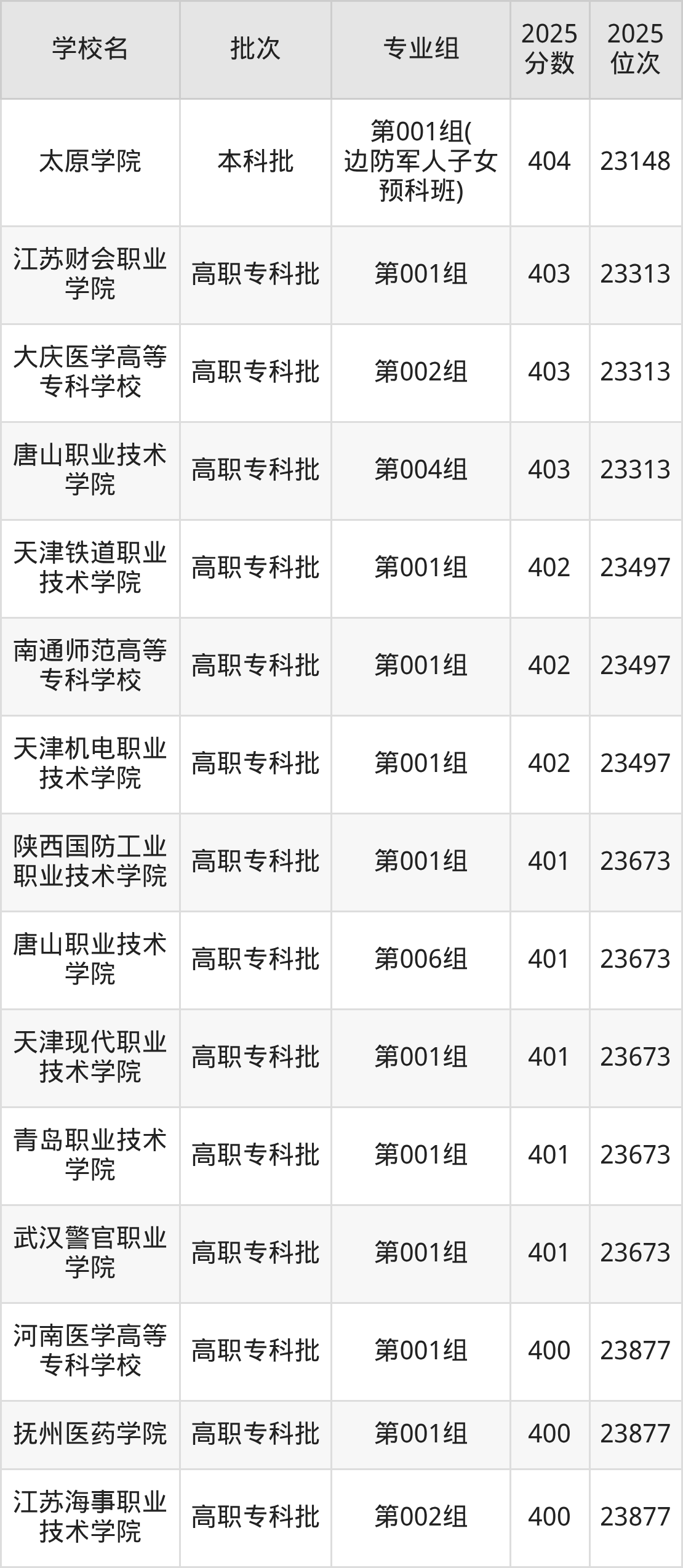 2025年黑龙江高考历史类402分(23314名~23497名)能上的大学有天津机电职业技术学院第001组、天津铁道职业技术学院第001组、南通师范高等专科学校第001组。