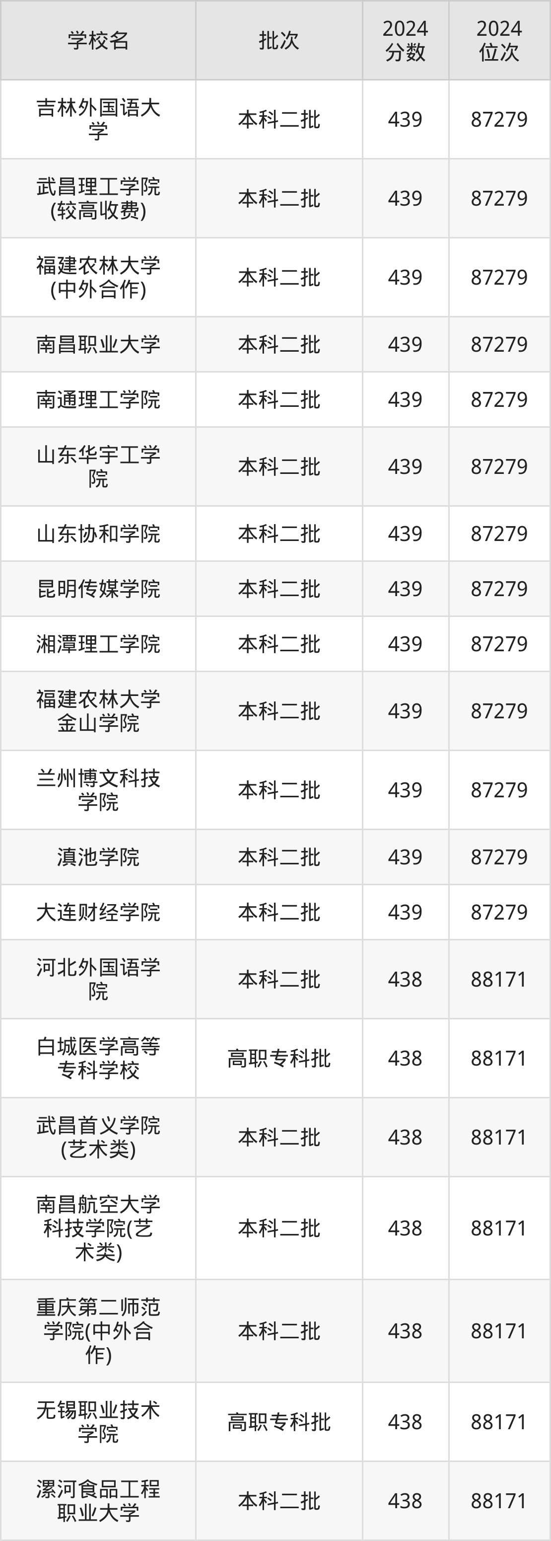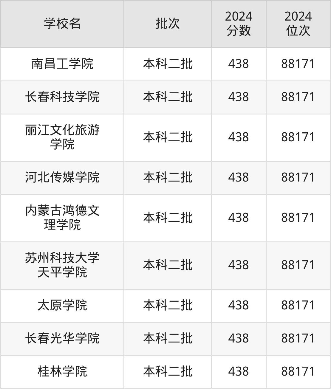2024年河南高考文科438分(87280名~88171名)能上的大学有河北传媒学院、内蒙古鸿德文理学院、苏州科技大学天平学院、太原学院等。