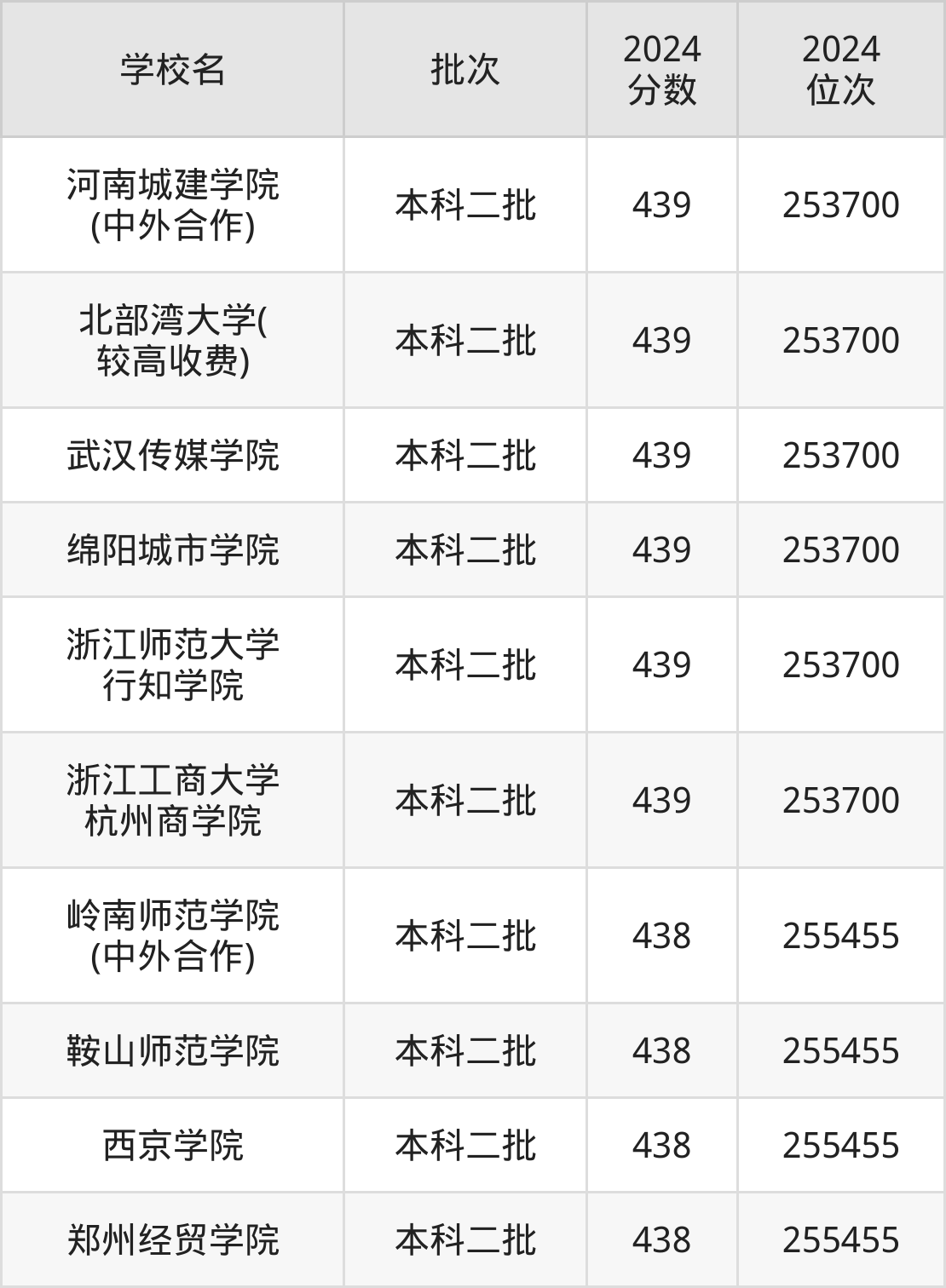 这些都是2025年高考理科253701名~255455名考生可以报考的大学,更多学校名单如下表所示: