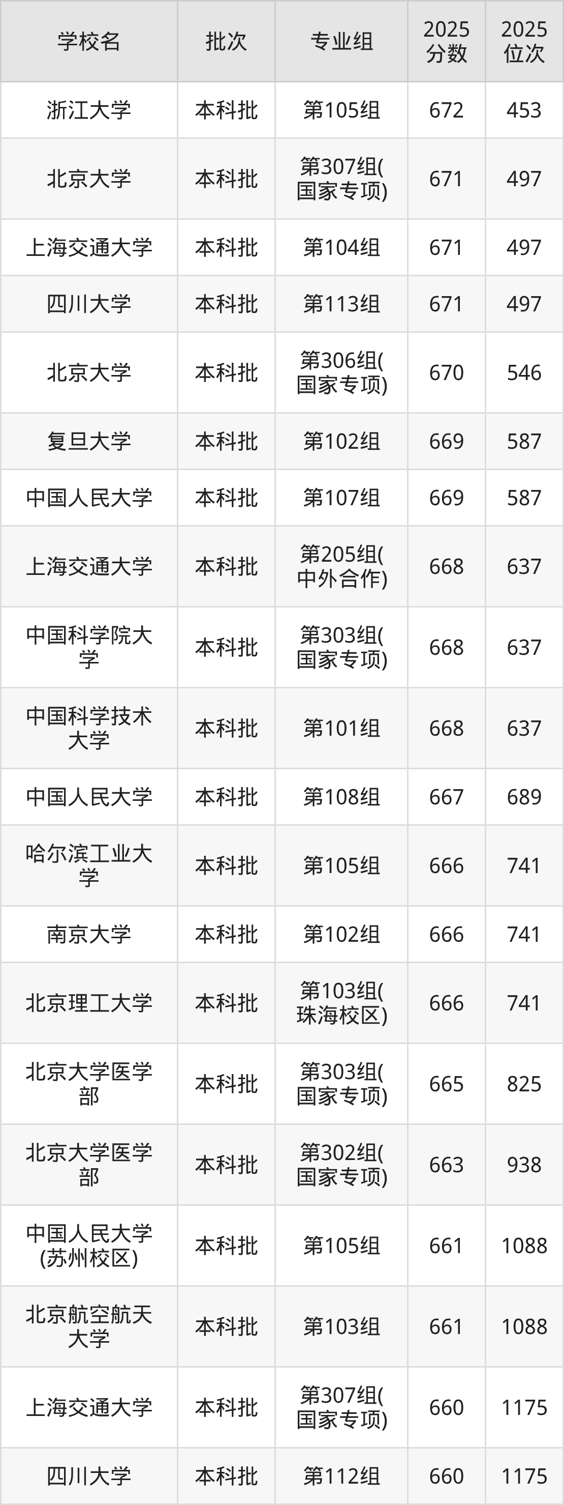 2025年湖南高考物理类662分(939名~1014名)录取位次低于该区间(较稳妥)的有北京航空航天大学第103组(1088名)、中国人民大学(苏州校区)第105组(1088名)等;录取位次高于该区间(可冲)的有北京大学医学部第302组(国家专项)(938名)、北京大学医学部第303组(国家专项)(825名)等。