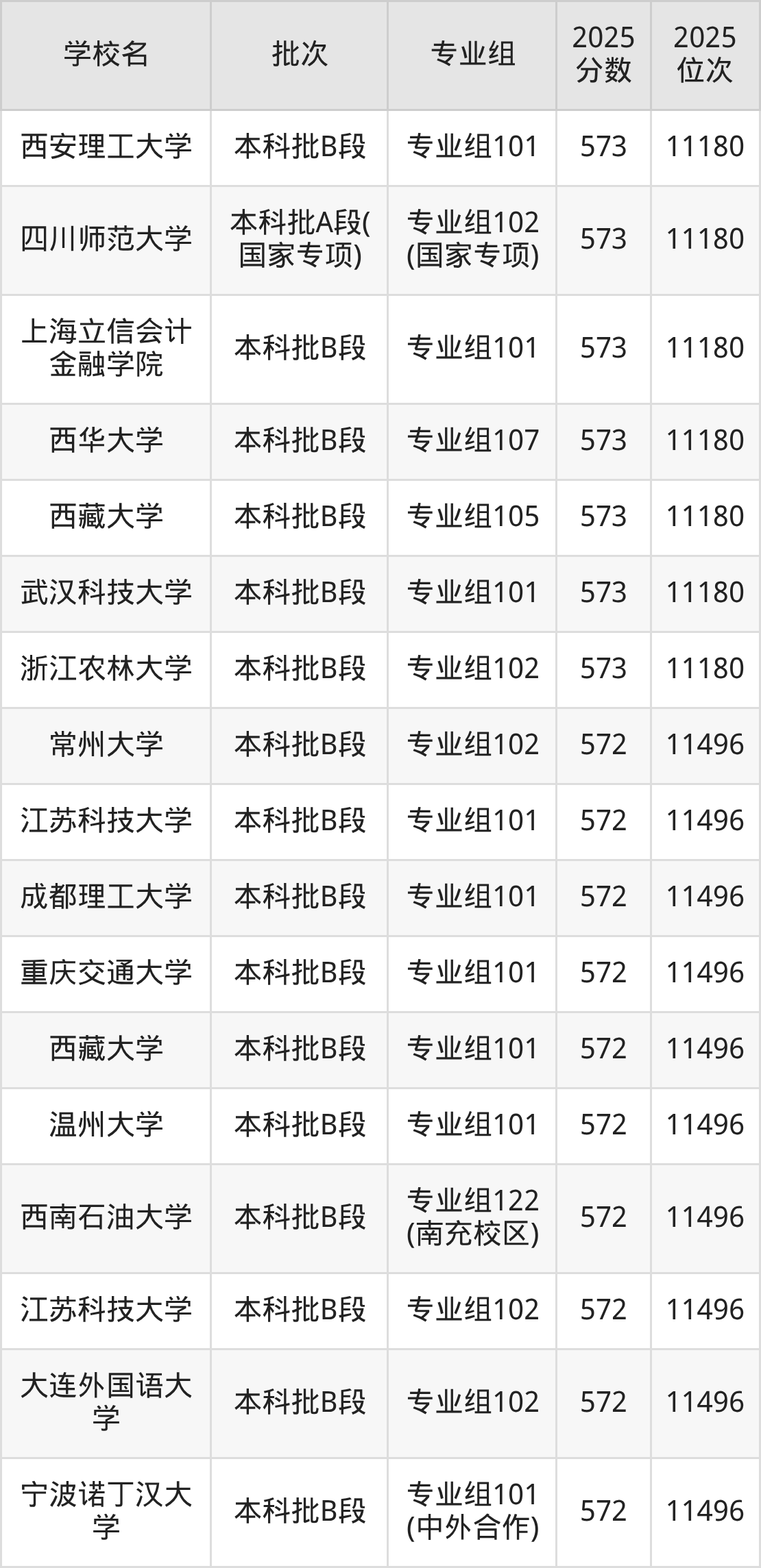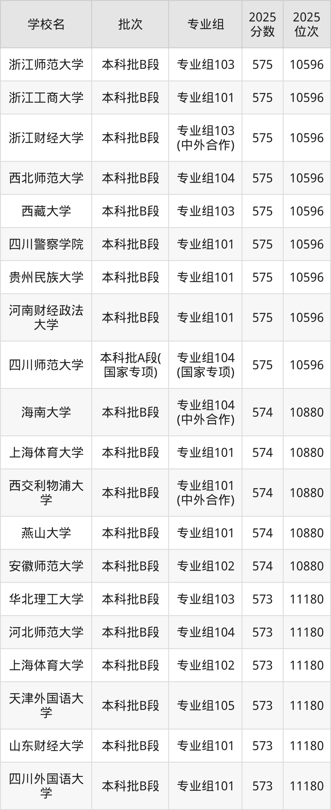 2025年四川高考历史类573分(10881名~11180名)能上的大学有浙江农林大学专业组102、武汉科技大学专业组101、上海体育大学专业组102、四川外国语大学专业组101等。