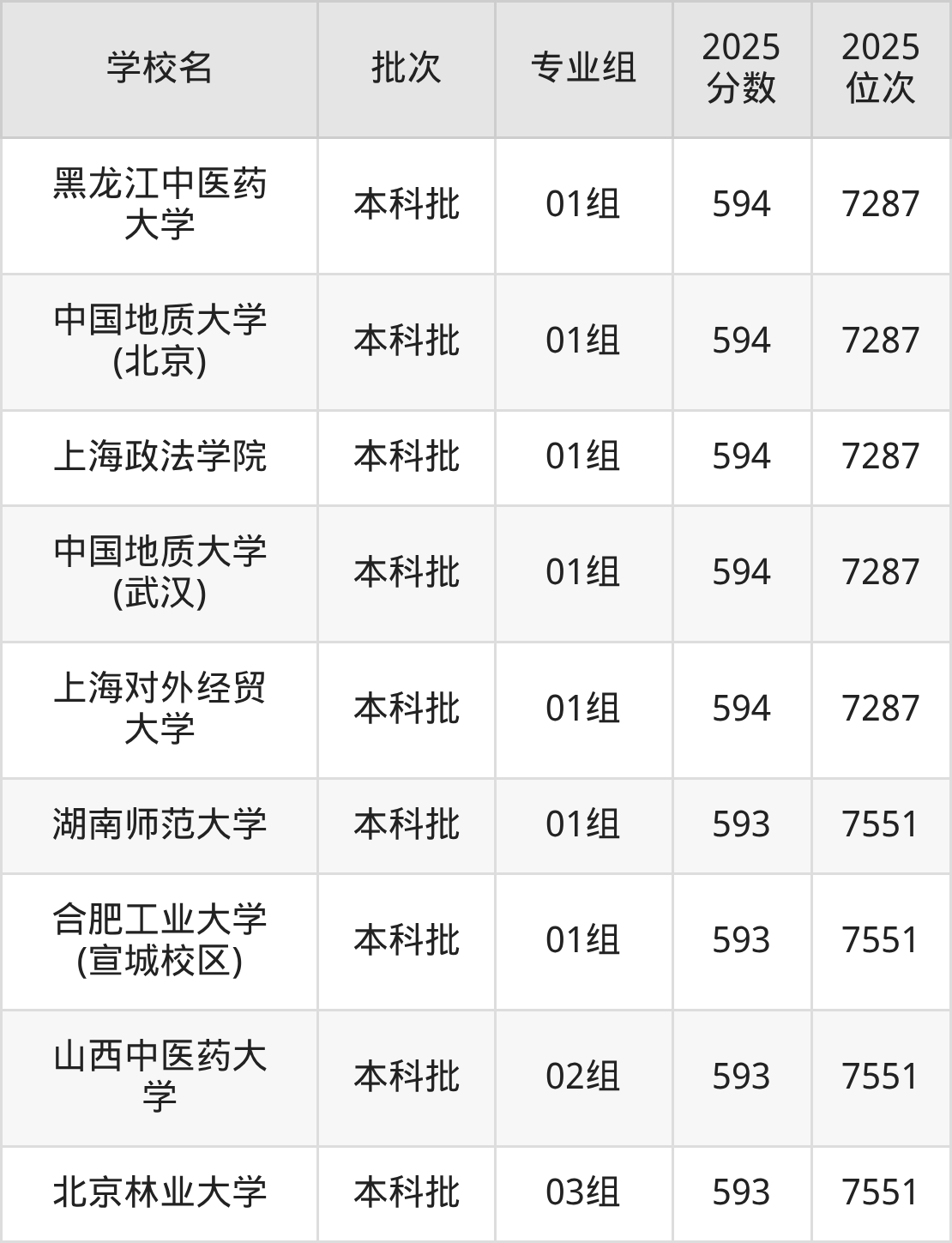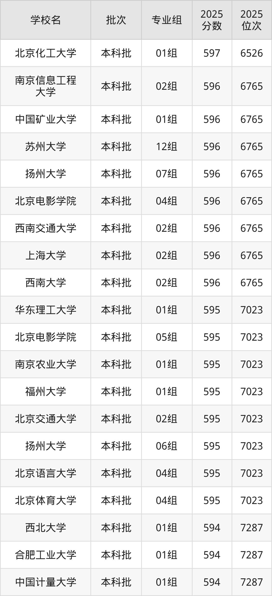 2025年江苏高考历史类594分(7024名~7287名)能上的大学有上海对外经贸大学01组、上海政法学院01组、中国计量大学01组、合肥工业大学01组等。