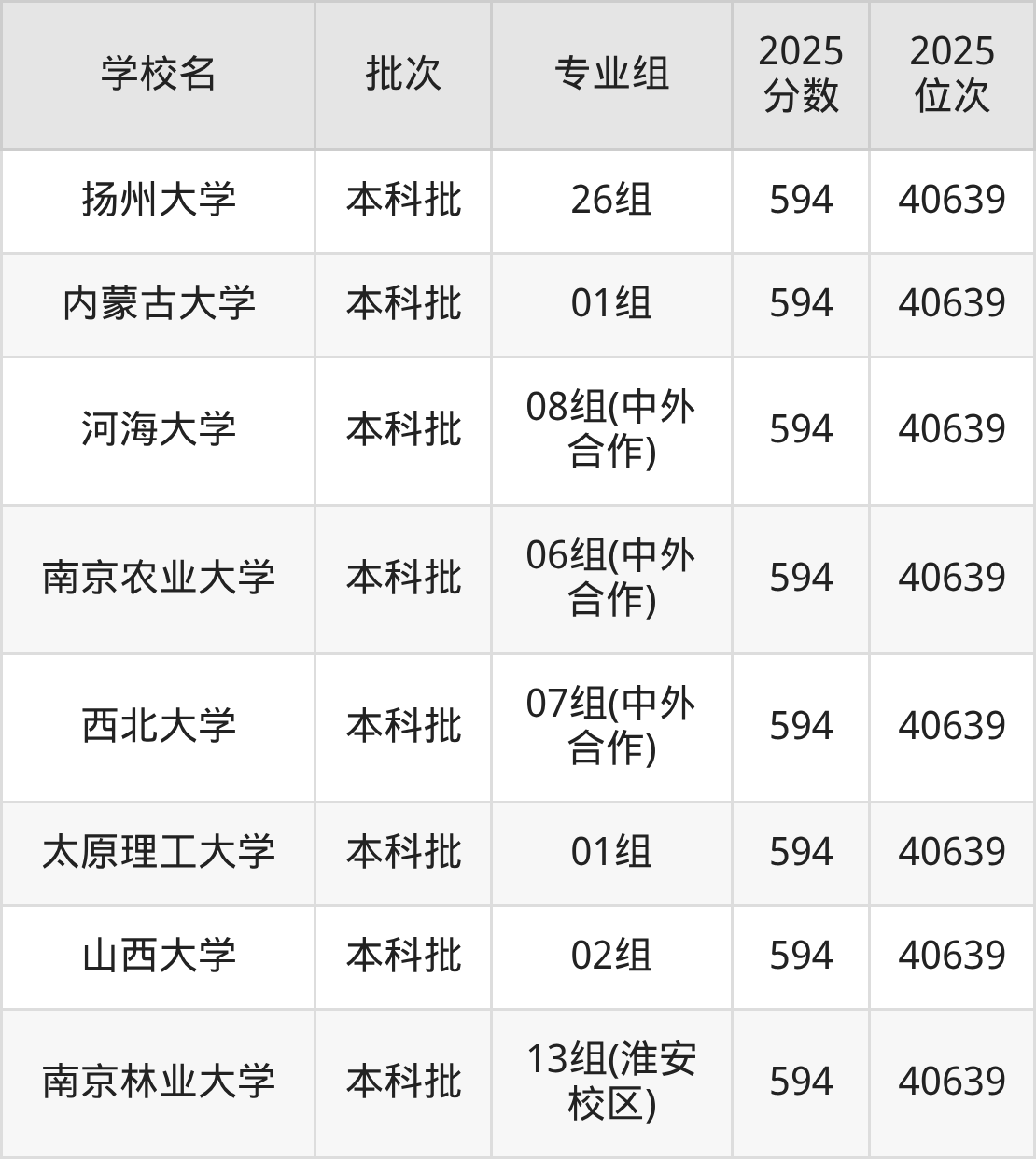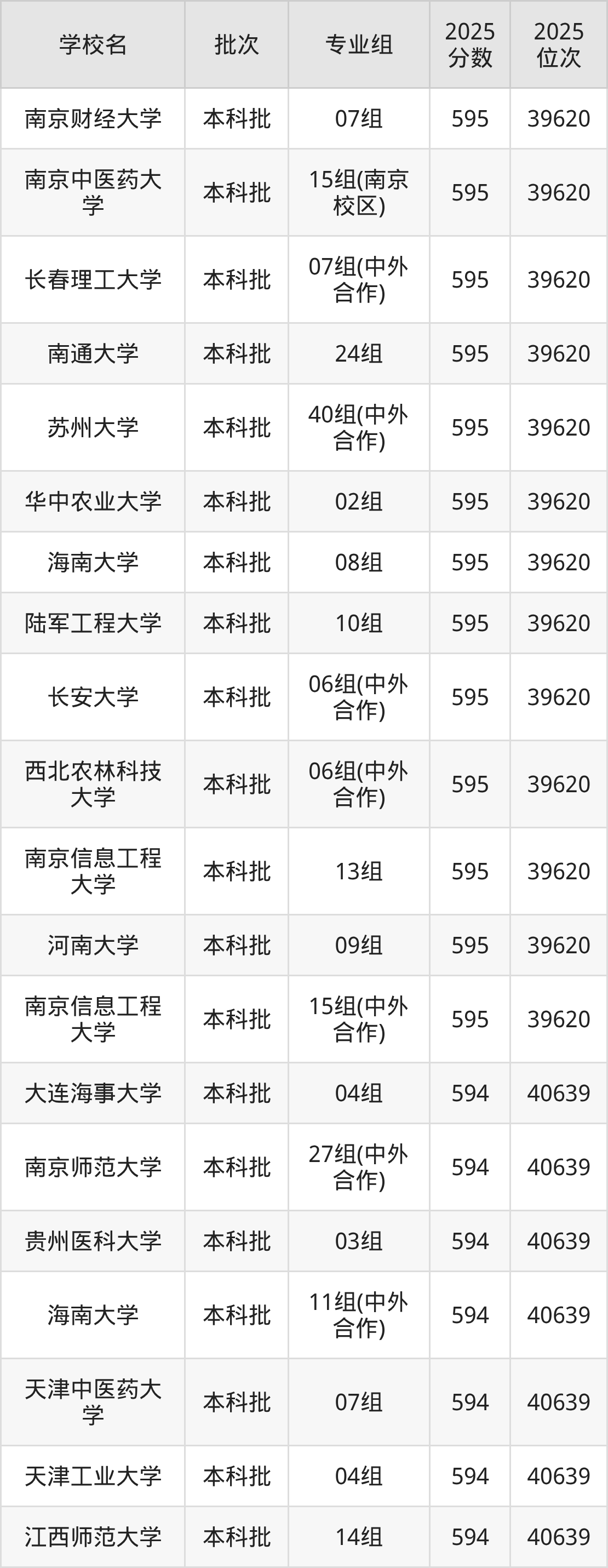 2025年江苏高考物理类594分(39621名~40639名)能上的大学有河海大学08组(中外合作)、南京农业大学06组(中外合作)、南京师范大学27组(中外合作)、南京林业大学13组(淮安校区)等。