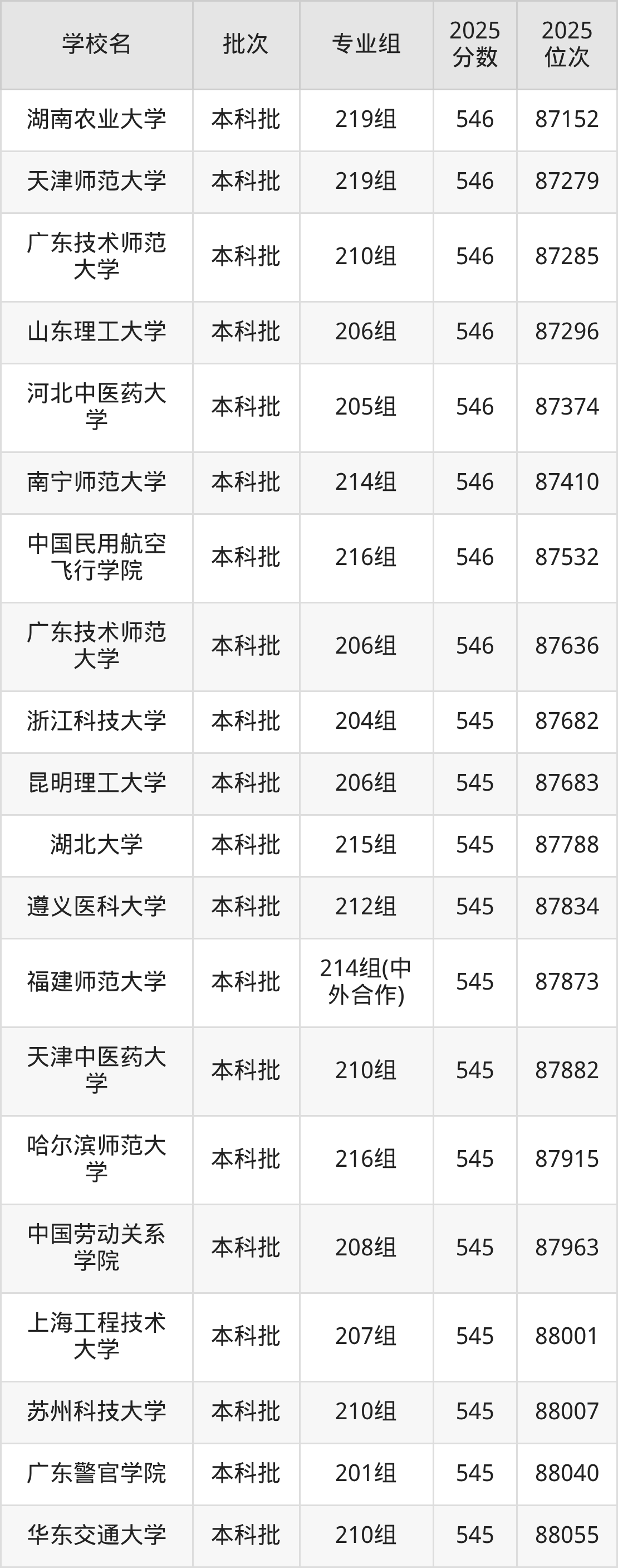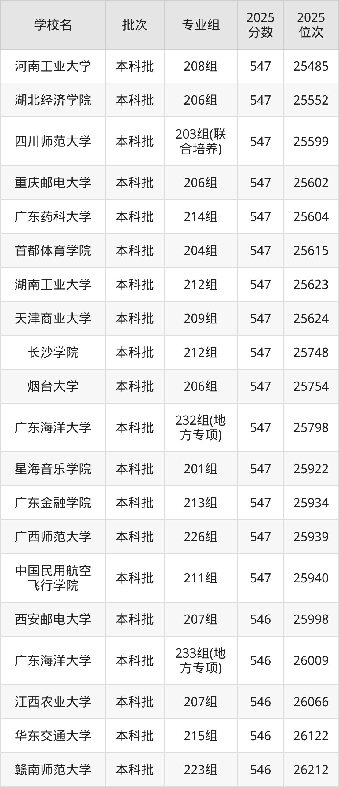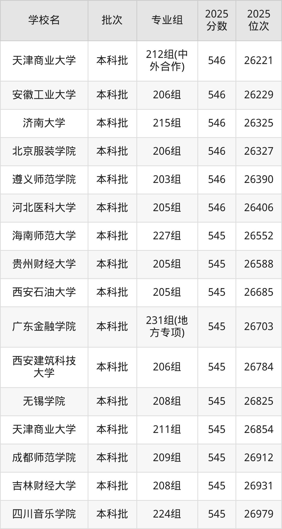 2025年广东高考历史类546分(25976名~26514名)能上的大学有北京服装学院206组、天津商业大学212组(中外合作)、河北医科大学205组、安徽工业大学206组等。