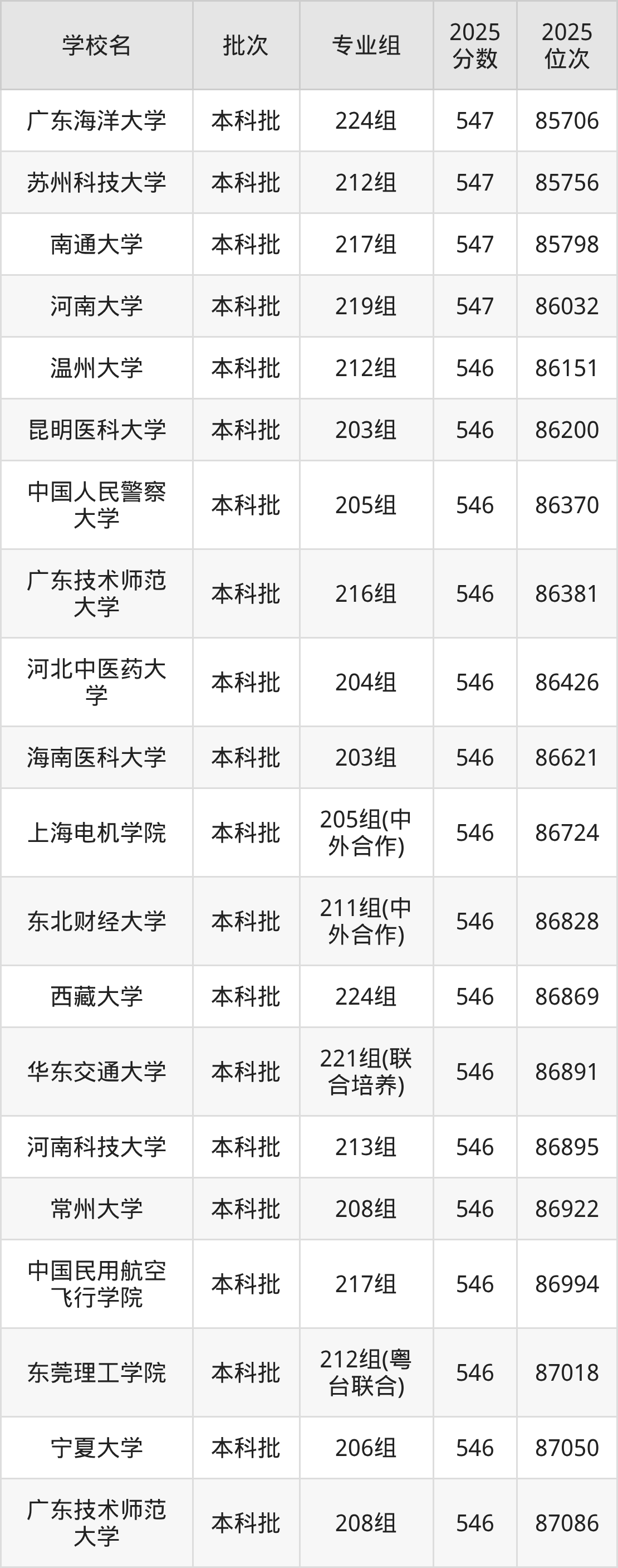 2025年广东高考物理类546分(86136名~87666名)能上的大学有天津师范大学219组、东北财经大学211组(中外合作)、常州大学208组、温州大学212组等。