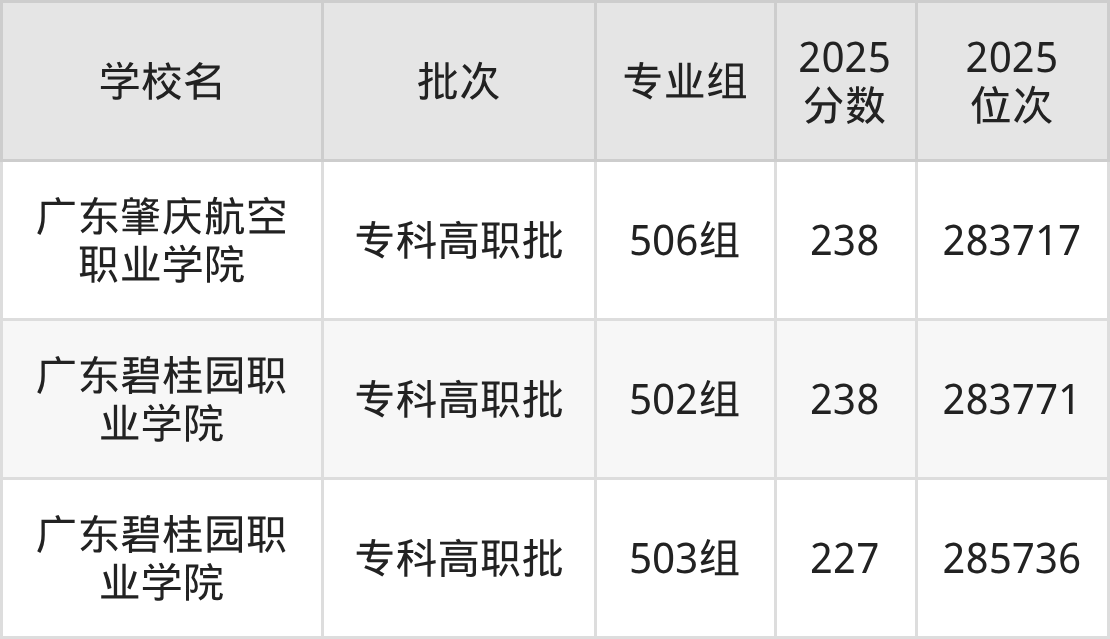 2025年广东高考历史类233分(284624名~284796名)录取位次低于该区间(较稳妥)的有广东碧桂园职业学院503组(285736名)、哈尔滨商贸职业学院503组(286154名)等;录取位次高于该区间(可冲)的有广东碧桂园职业学院502组(283771名)、广东肇庆航空职业学院506组(283717名)等。