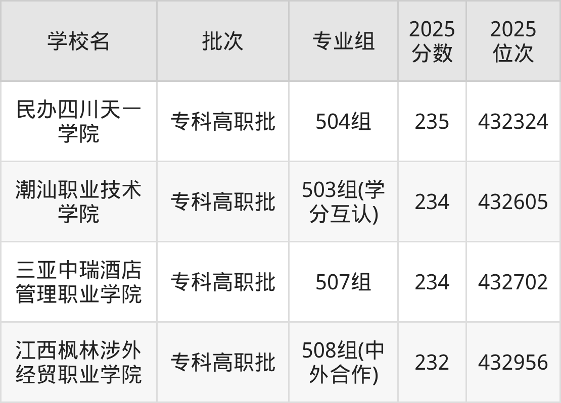 2025年广东高考物理类233分(432733名~432948名)录取位次低于该区间(较稳妥)的有江西枫林涉外经贸职业学院508组(中外合作)(432956名)、贵州工商职业学院504组(433528名)等;录取位次高于该区间(可冲)的有三亚中瑞酒店管理职业学院507组(432702名)、潮汕职业技术学院503组(学分互认)(432605名)等。