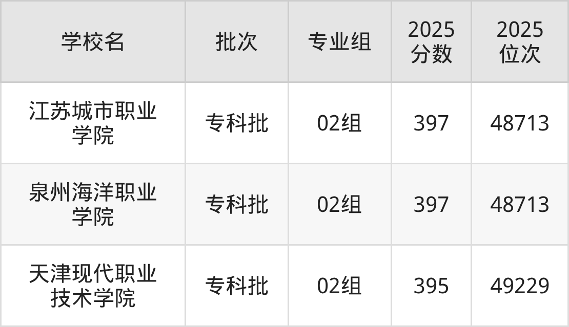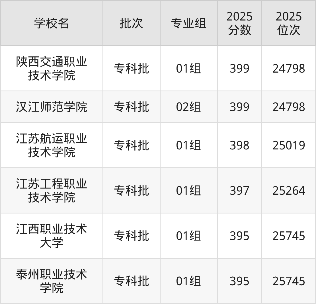 2025年江苏高考历史类396分(25265名~25510名)录取位次低于该区间(较稳妥)的有泰州职业技术学院01组(25745名)、江西职业技术大学01组(25745名)等;录取位次高于该区间(可冲)的有青岛电影学院01组(56398名)、桂林旅游学院01组(中外合作)(56398名)等。