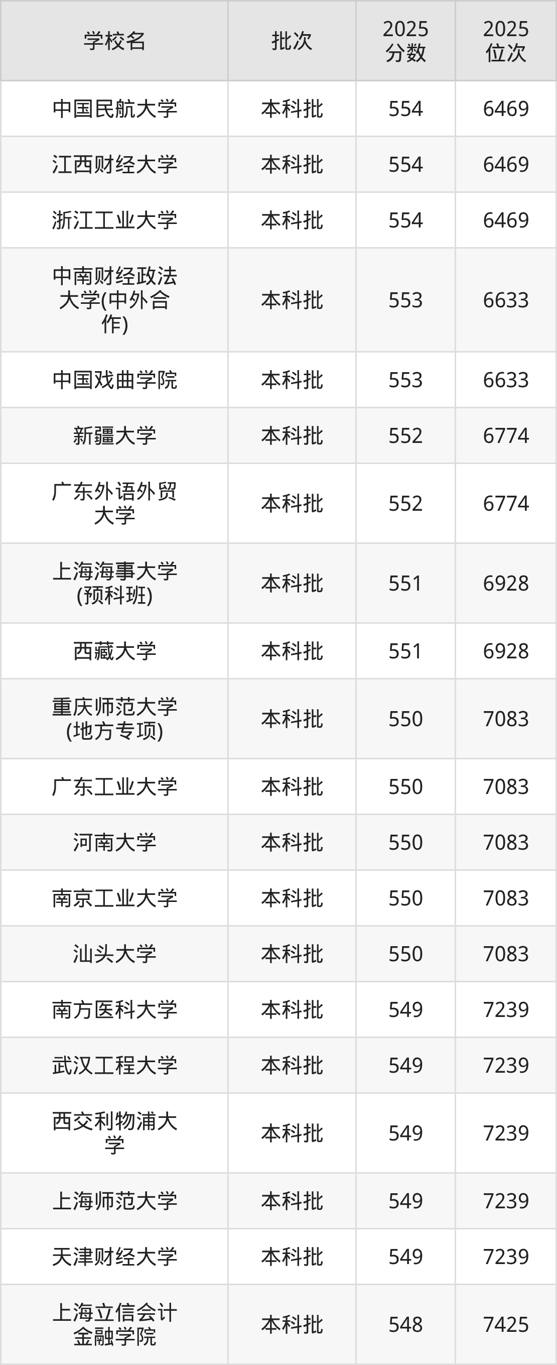 2025年重庆高考历史类550分(6929名~7083名)能上的大学有汕头大学、广东工业大学、重庆师范大学(地方专项)、河南大学等。