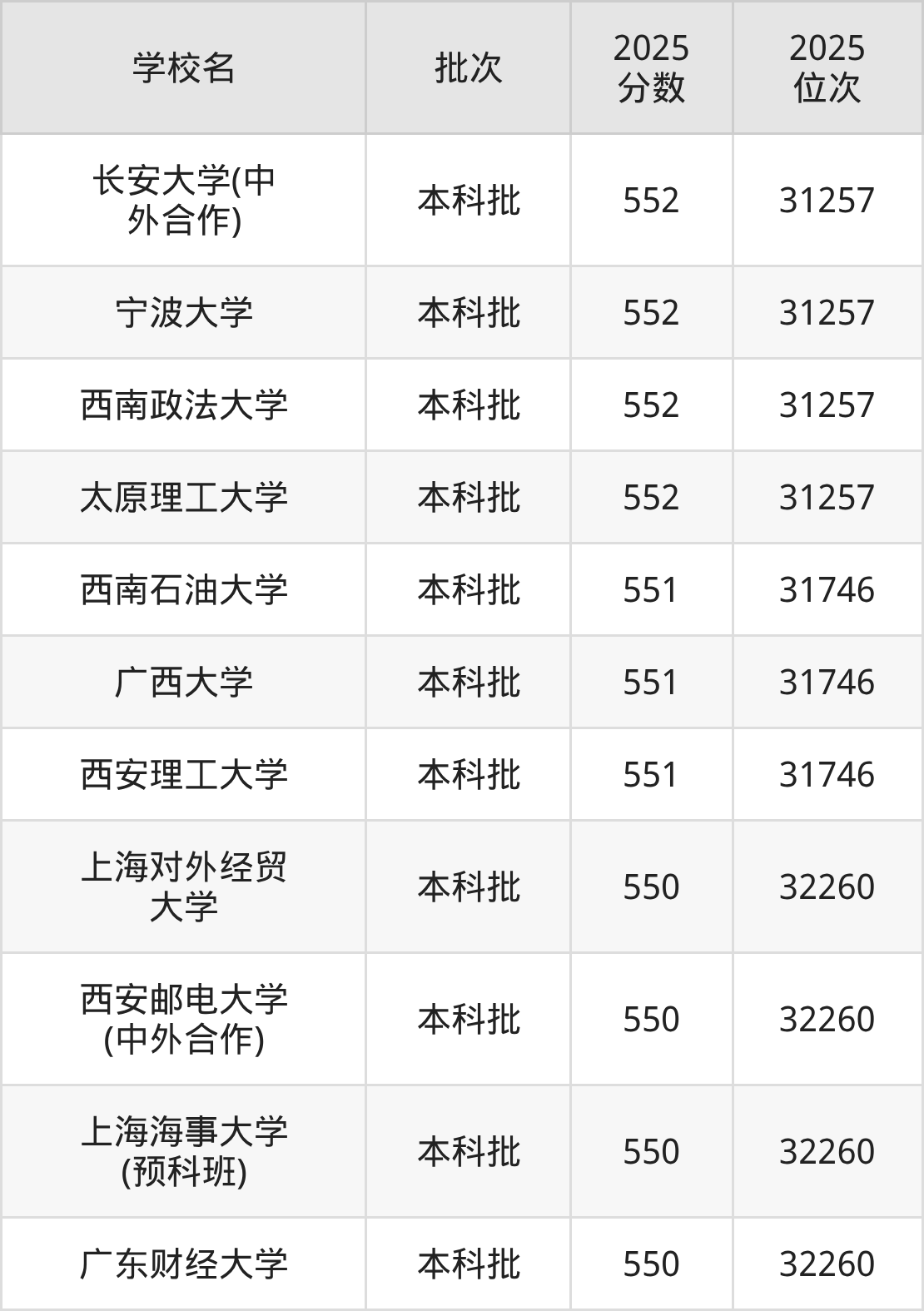 2025年重庆高考物理类550分(31747名~32260名)能上的大学有广东财经大学、上海海事大学(预科班)、上海对外经贸大学、西安邮电大学(中外合作)。