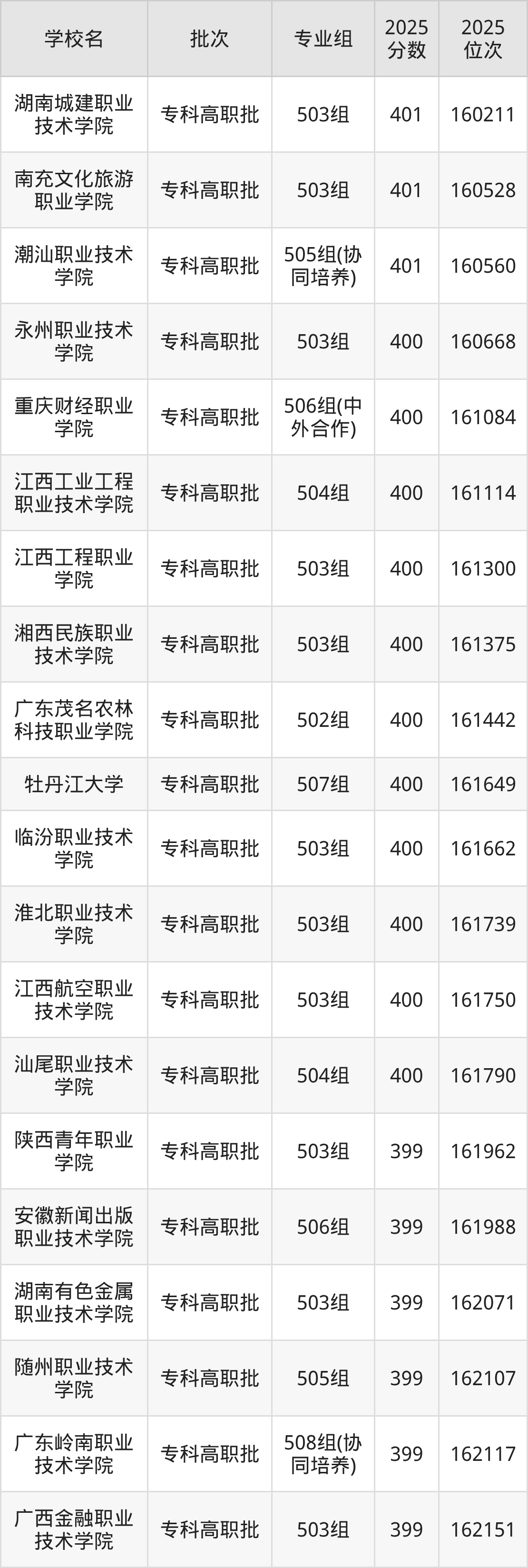 2025年广东高考历史类400分(160599名~161800名)能上的大学有淮北职业技术学院503组、牡丹江大学507组、永州职业技术学院503组、汕尾职业技术学院504组等。