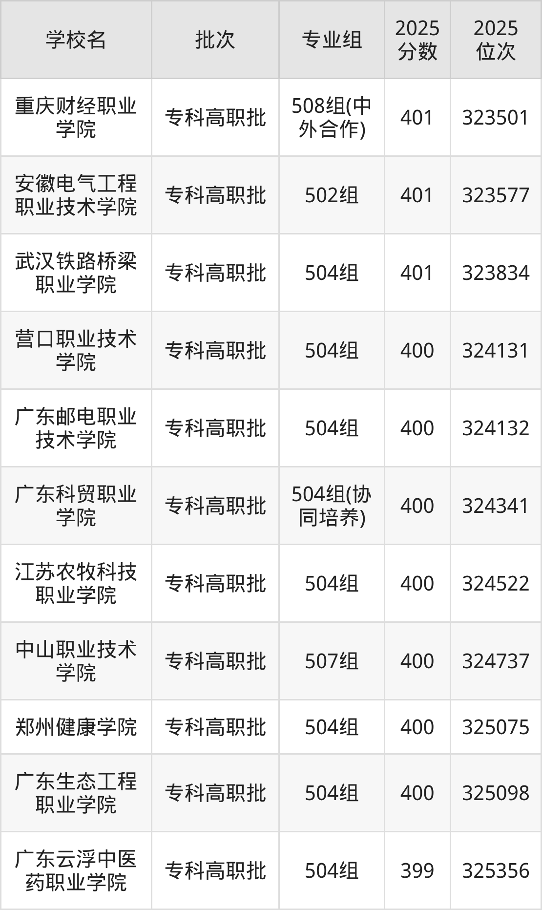 2025年广东高考物理类400分(323942名~325155名)能上的大学有营口职业技术学院504组、江苏农牧科技职业学院504组、郑州健康学院504组、广东邮电职业技术学院504组等。