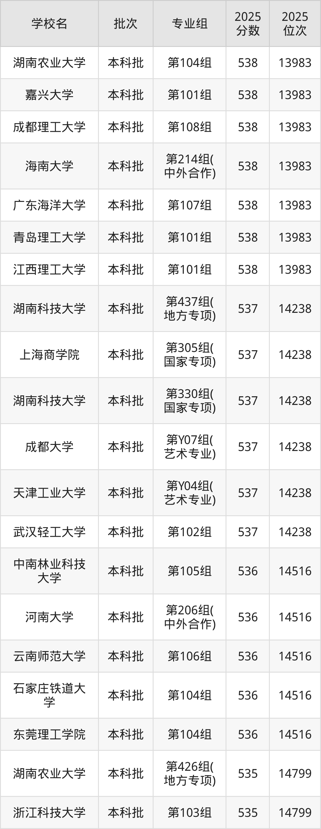 2025年湖南高考历史类536分(14239名~14516名)能上的大学有石家庄铁道大学第104组、河南大学第206组(中外合作)、中南林业科技大学第105组、东莞理工学院第104组等。