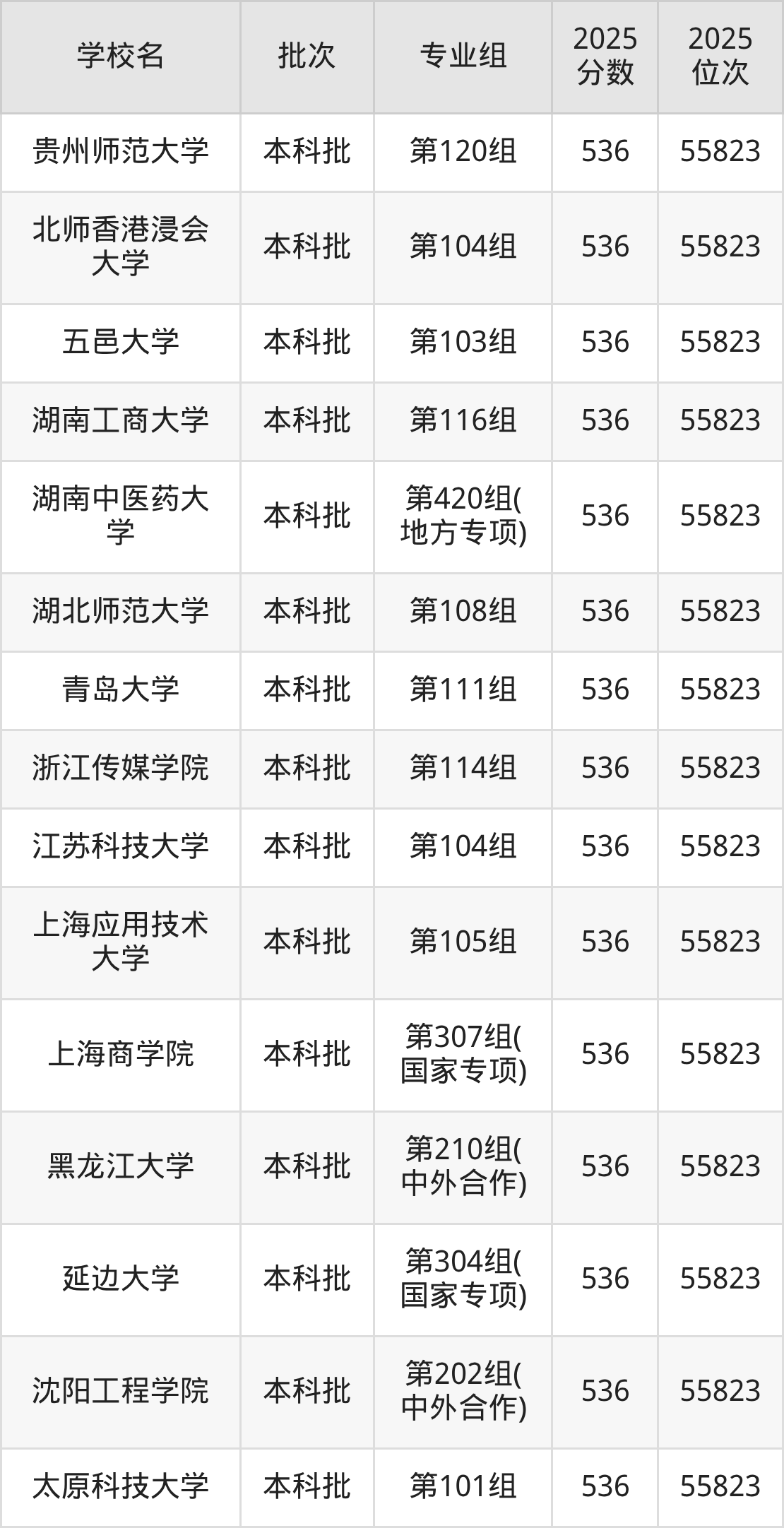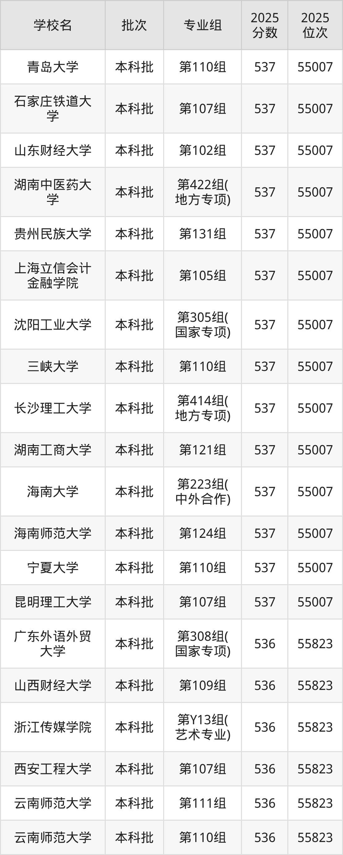 2025年湖南高考物理类536分(55008名~55823名)能上的大学有山西财经大学第109组、太原科技大学第101组、沈阳工程学院第202组(中外合作)、延边大学第304组(国家专项)等。