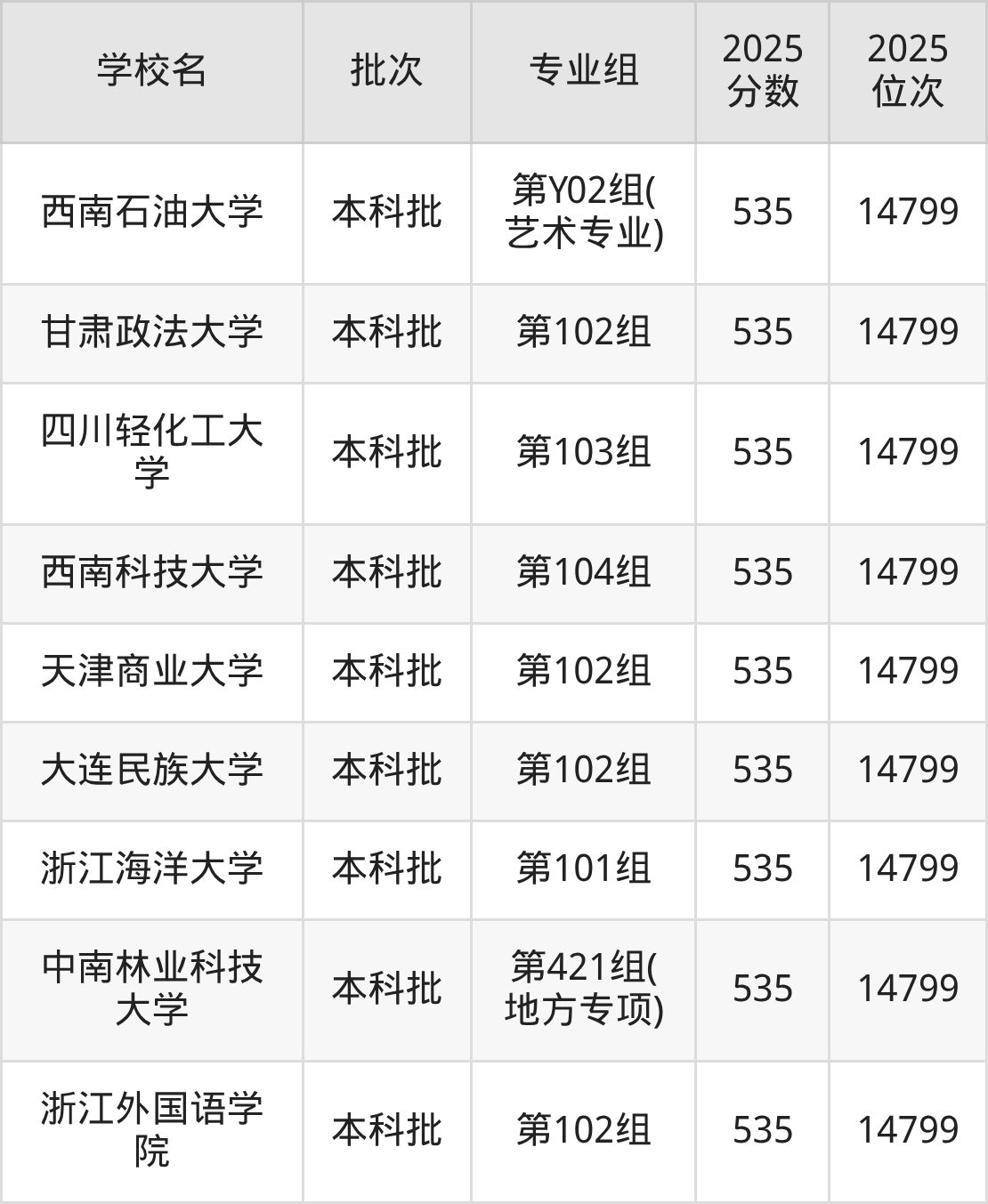 这些都是2026年高考历史类14239名~14516名考生可以报考的大学,更多学校名单如下表所示: