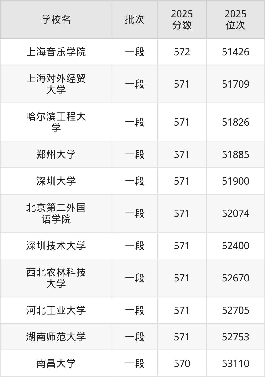 2025年山东高考571分(51673名~52899名)能上的大学有北京第二外国语学院、深圳技术大学、哈尔滨工程大学、郑州大学等。