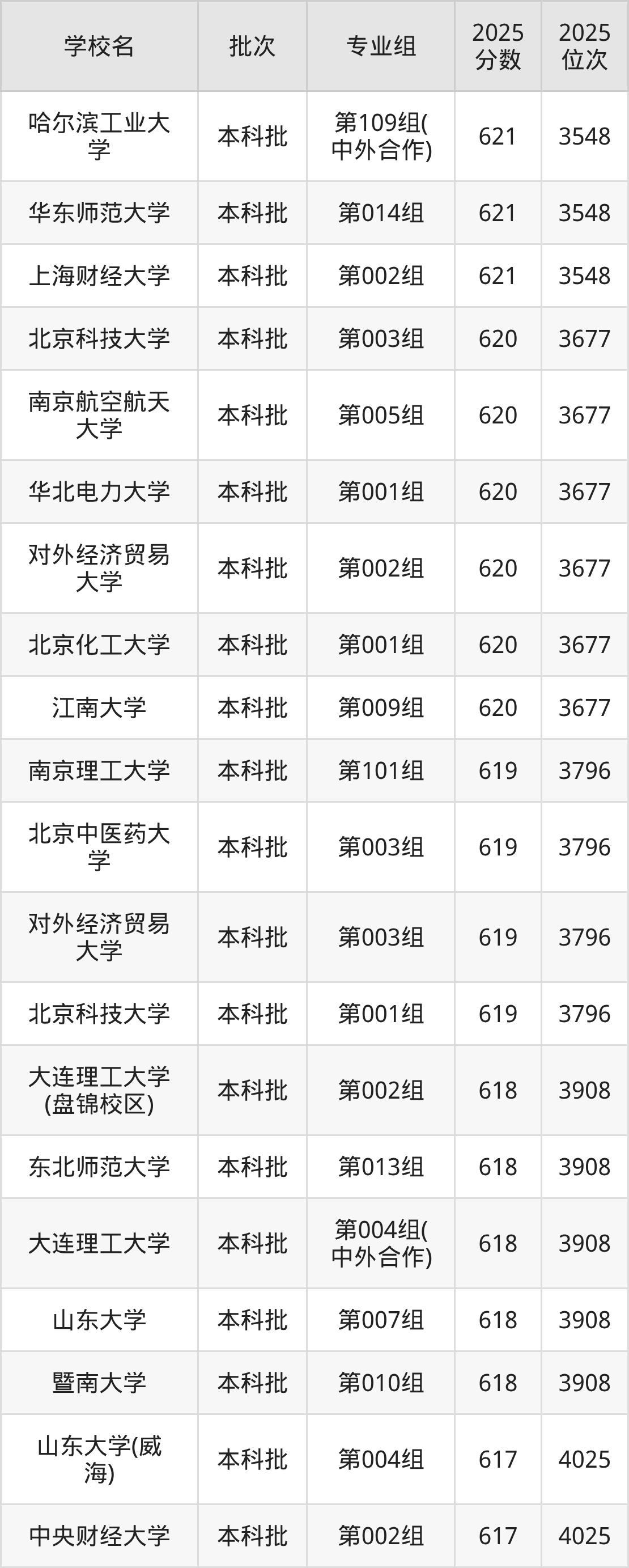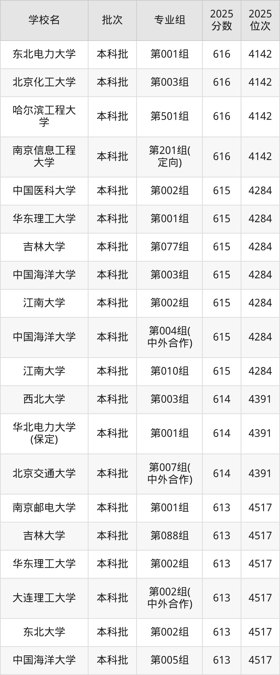 2025年内蒙古高考物理类616分(4026名~4142名)能上的大学有北京化工大学第003组、南京信息工程大学第201组(定向)、哈尔滨工程大学第501组、东北电力大学第001组。