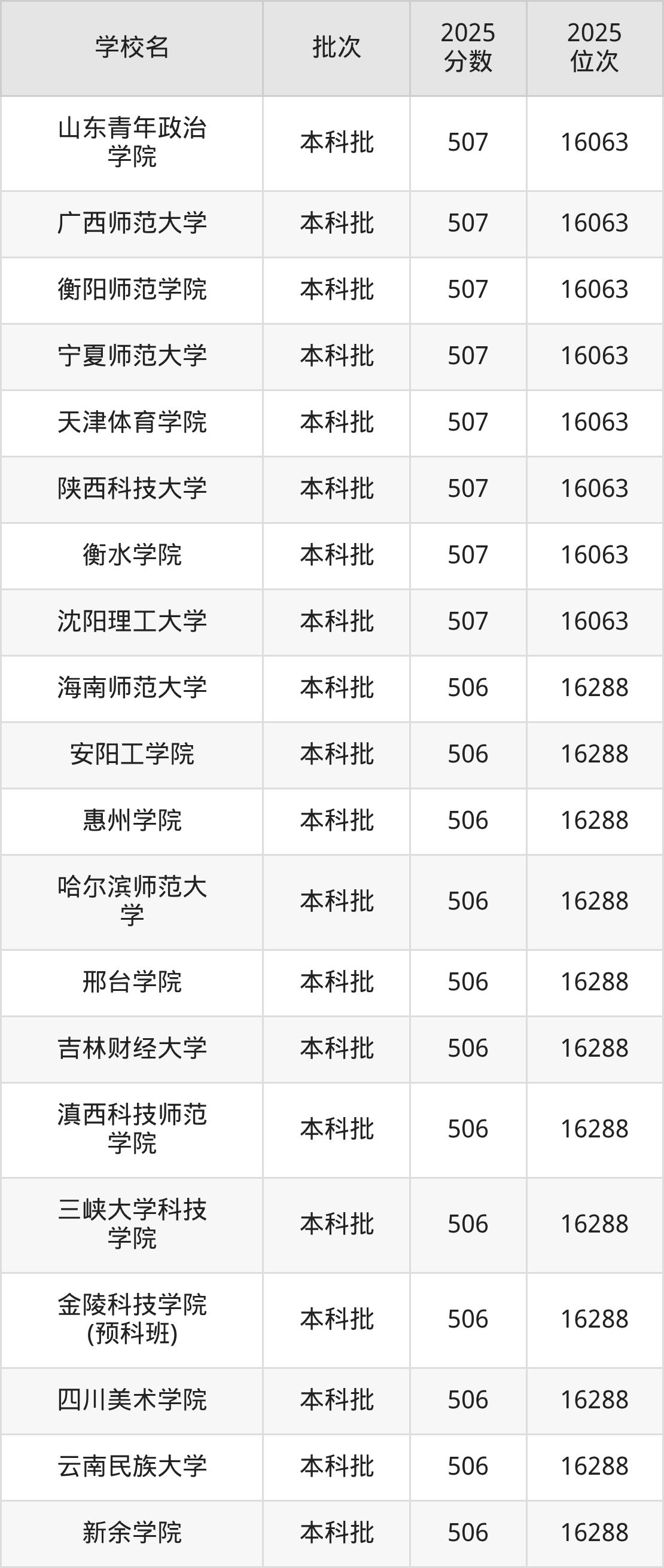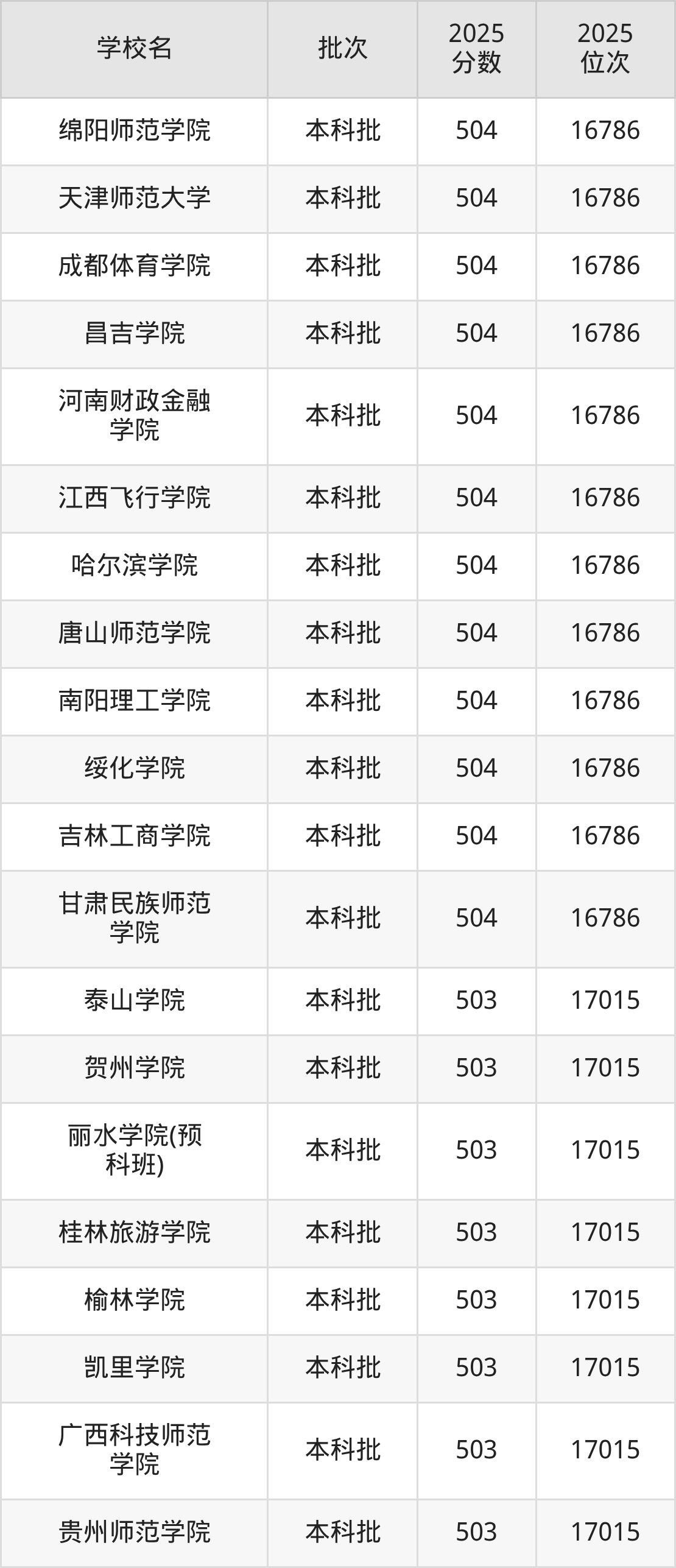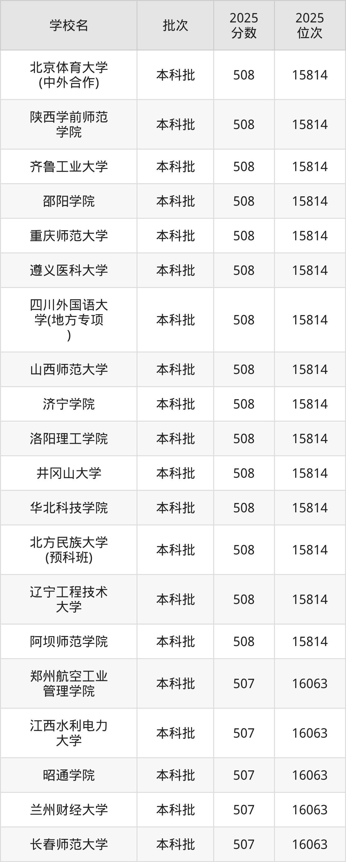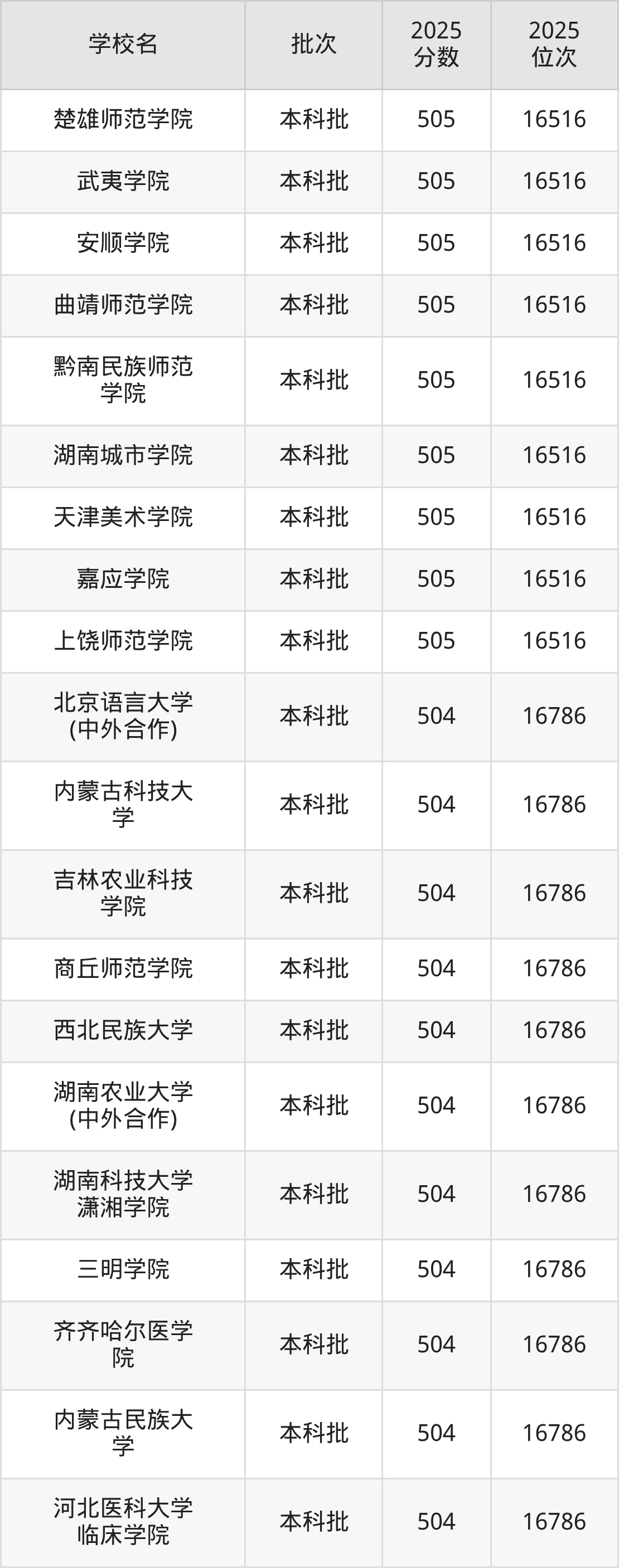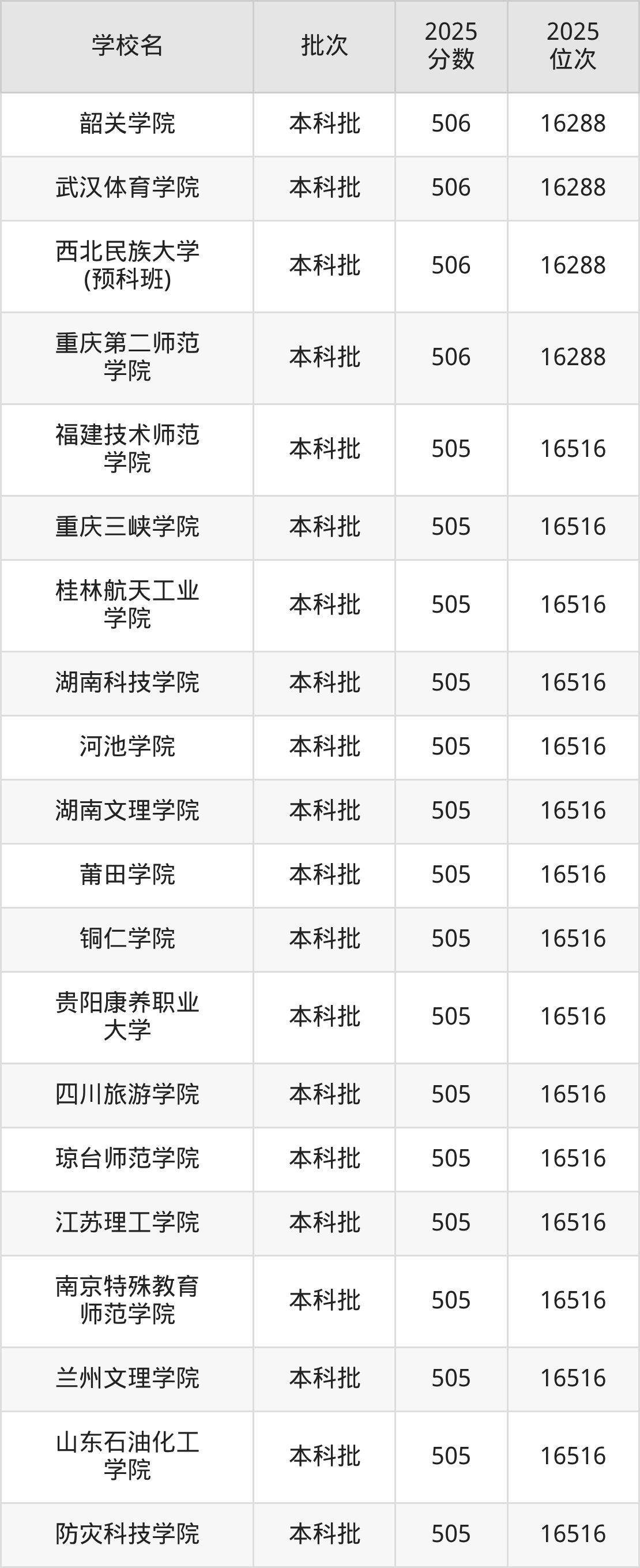 2025年重庆高考历史类505分(16289名~16516名)能上的大学有安顺学院、防灾科技学院、桂林航天工业学院、湖南科技学院等。