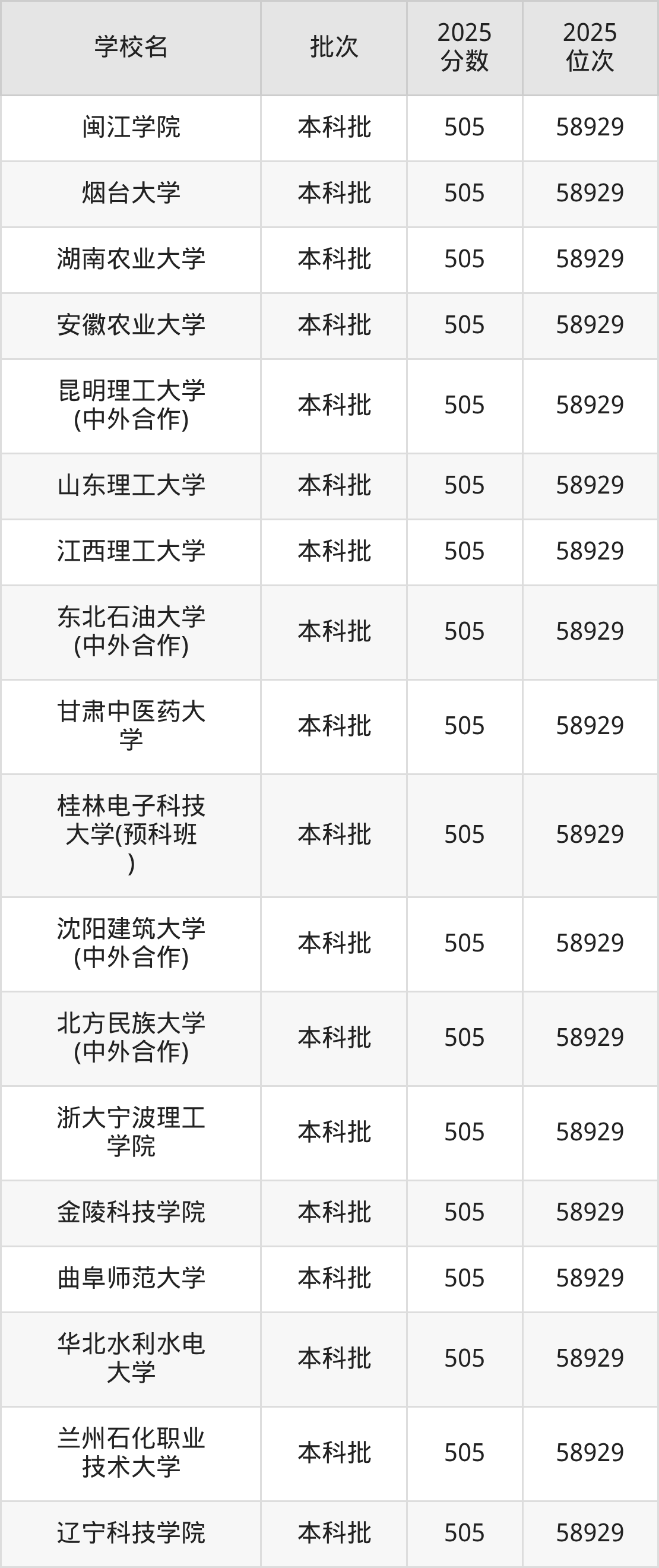 2025年重庆高考物理类505分(58278名~58929名)能上的大学有辽宁科技学院、兰州石化职业技术大学、华北水利水电大学、曲阜师范大学等。