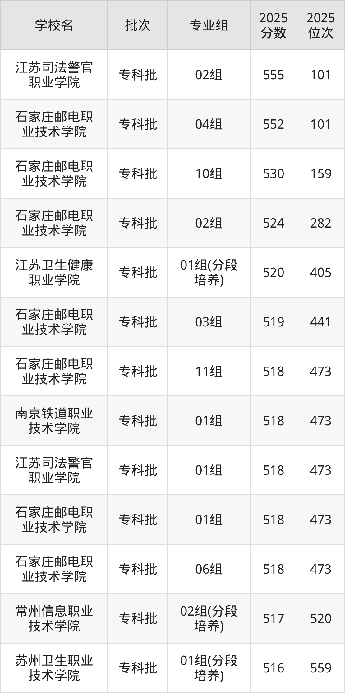 另外录取位次低于该区间(较稳妥)的有江苏司法警官职业学院05组(373名)、江苏司法警官职业学院04组(1195名)等;录取位次高于该区间(可冲)的有南京中医药大学18组(中外合作)(泰州校区)(106680名)、南京财经大学13组(中外合作)(106680名)等。