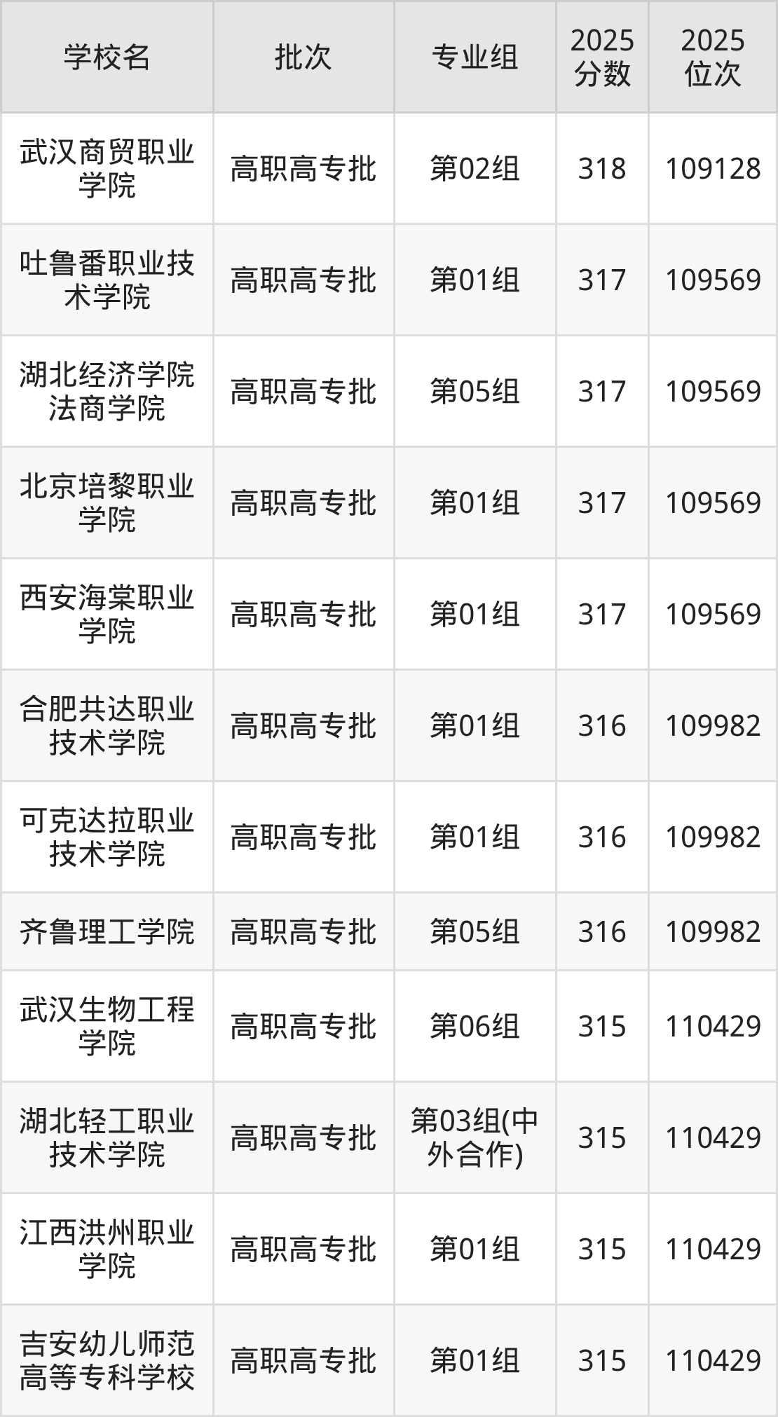2025年湖北高考历史类316分(109570名~109982名)能上的大学有齐鲁理工学院第05组、合肥共达职业技术学院第01组、可克达拉职业技术学院第01组。