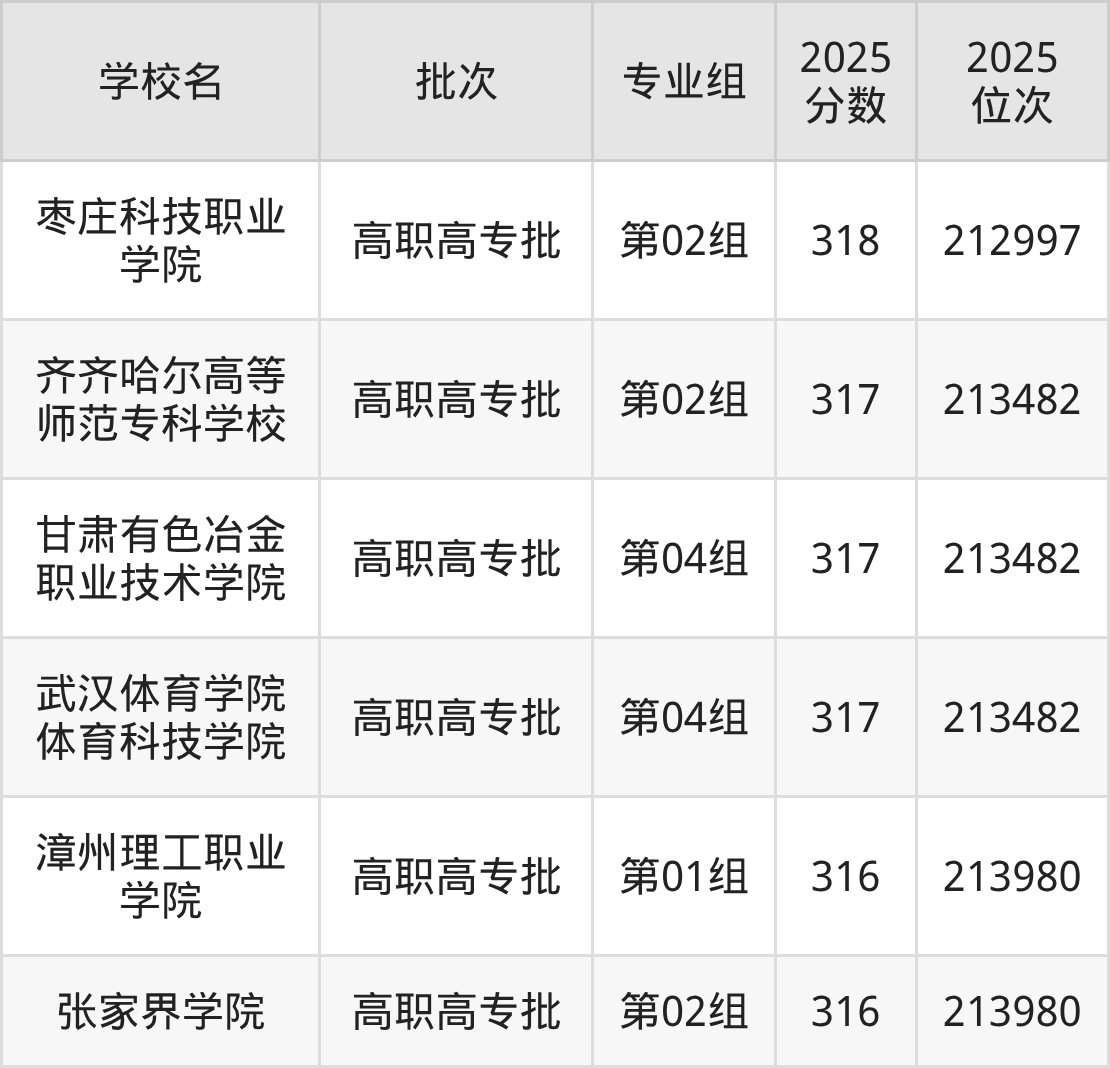 2025年湖北高考物理类316分(213483名~213980名)能上的大学有张家界学院第02组、漳州理工职业学院第01组。