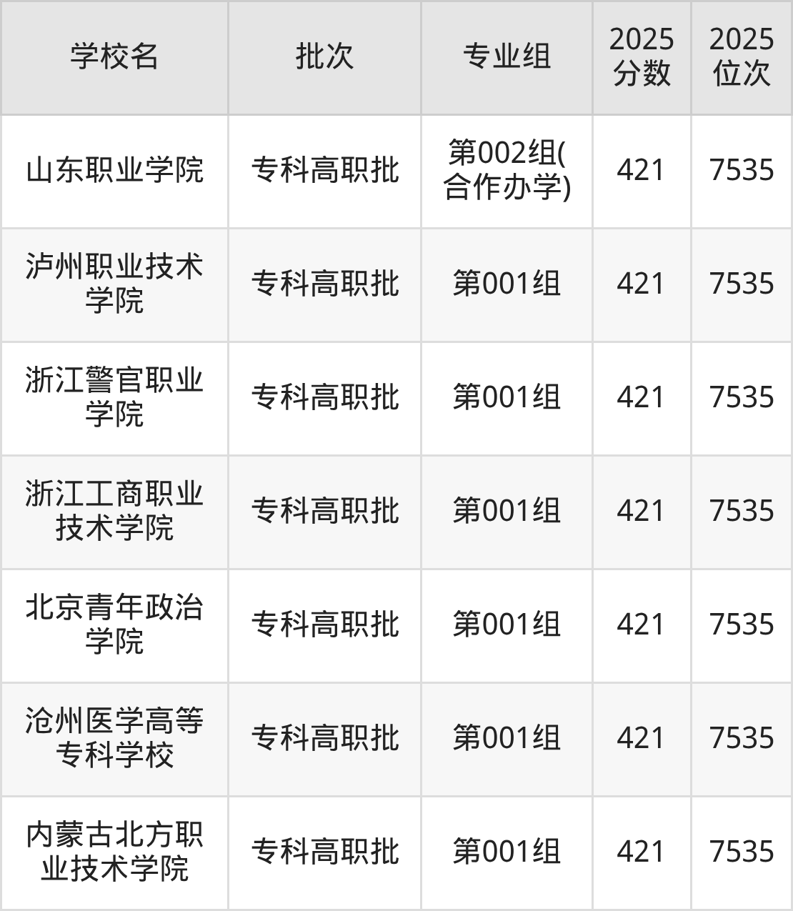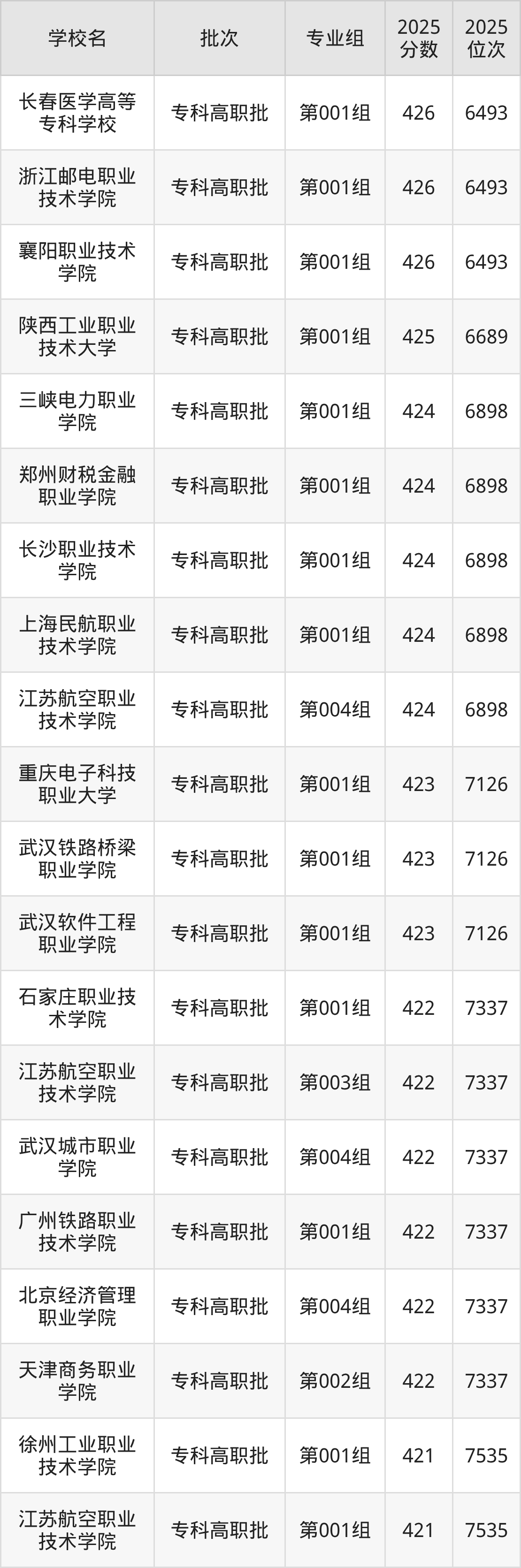 2025年山西高考历史类423分(6899名~7126名)能上的大学有武汉软件工程职业学院第001组、武汉铁路桥梁职业学院第001组、重庆电子科技职业大学第001组。