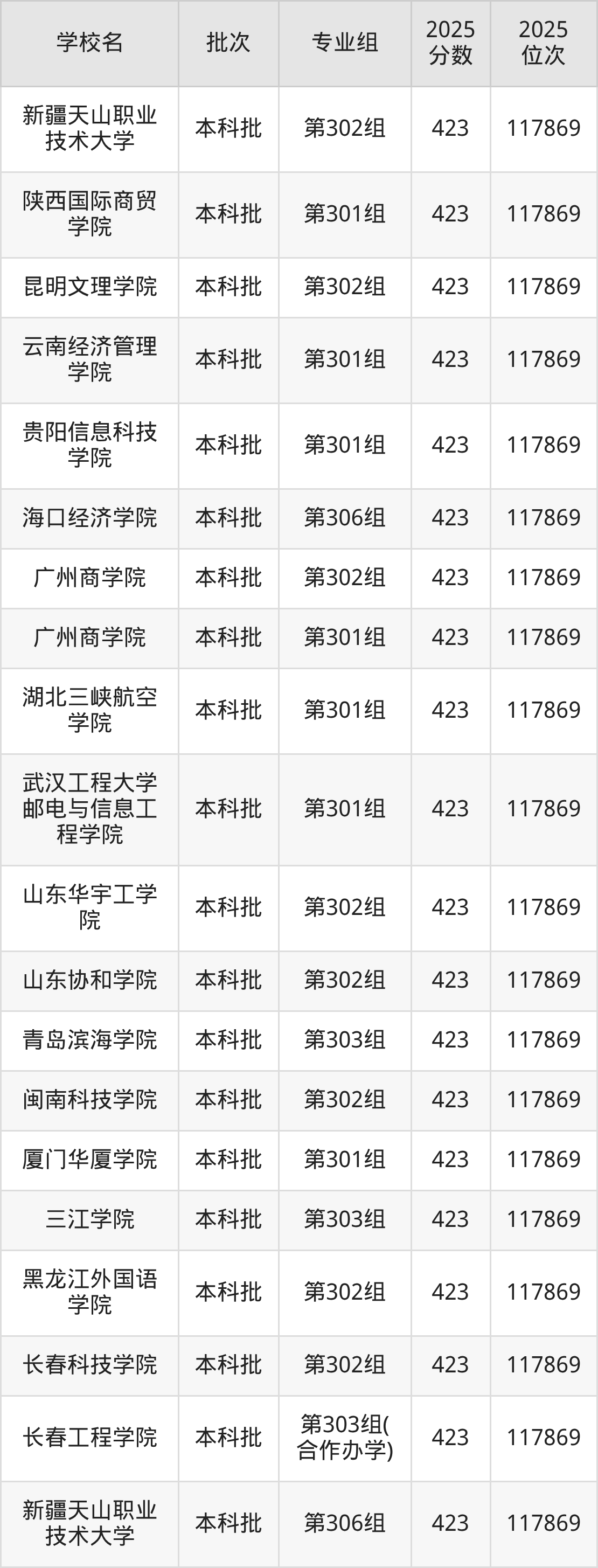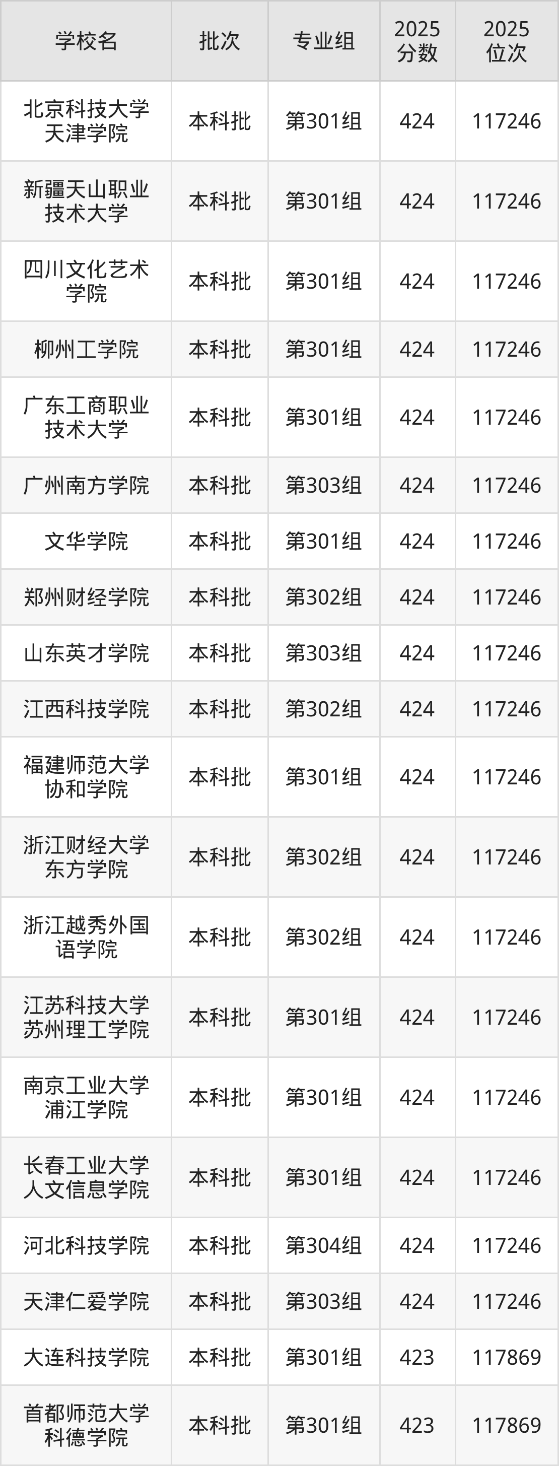 2025年山西高考物理类423分(117247名~117869名)能上的大学有首都师范大学科德学院第301组、天津仁爱学院第301组、保定理工学院第301组、河北东方学院第302组等。