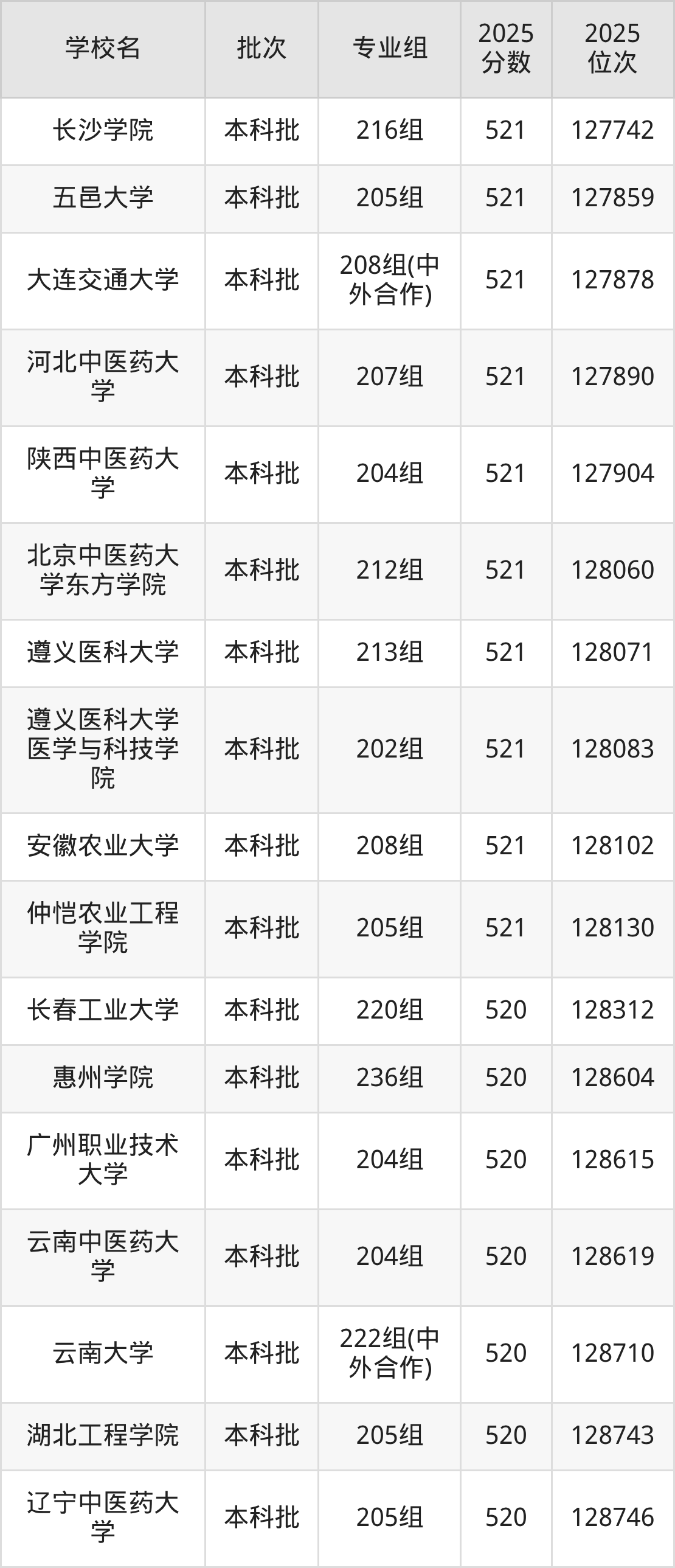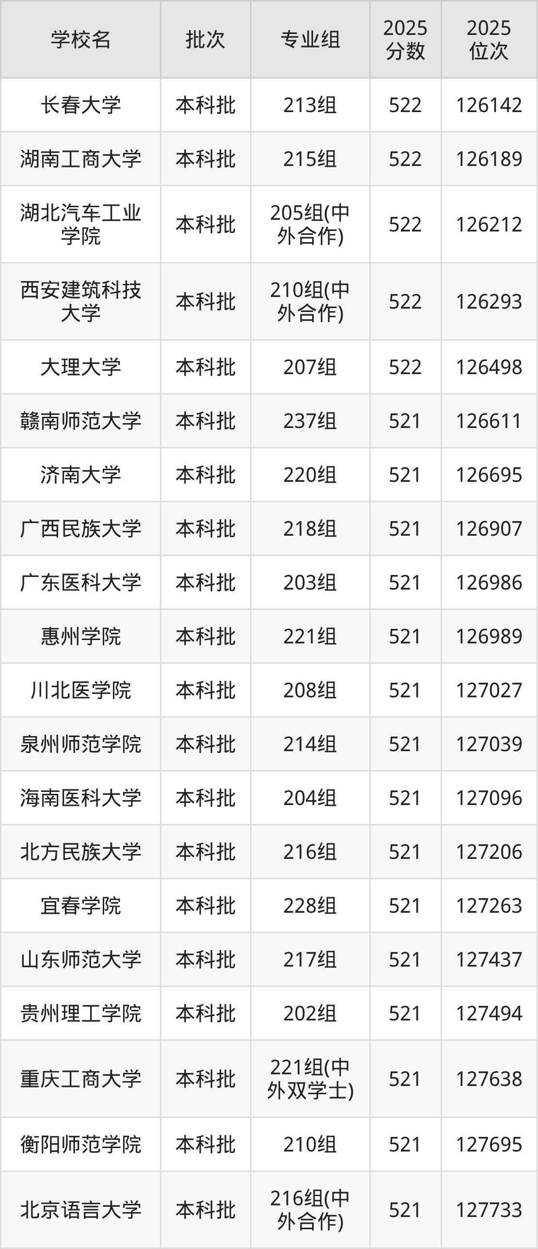 另外录取位次低于该区间(较稳妥)的有长春工业大学220组(128312名)、惠州学院236组(128604名)等;录取位次高于该区间(可冲)的有大理大学207组(126498名)、西安建筑科技大学210组(中外合作)(126293名)等。