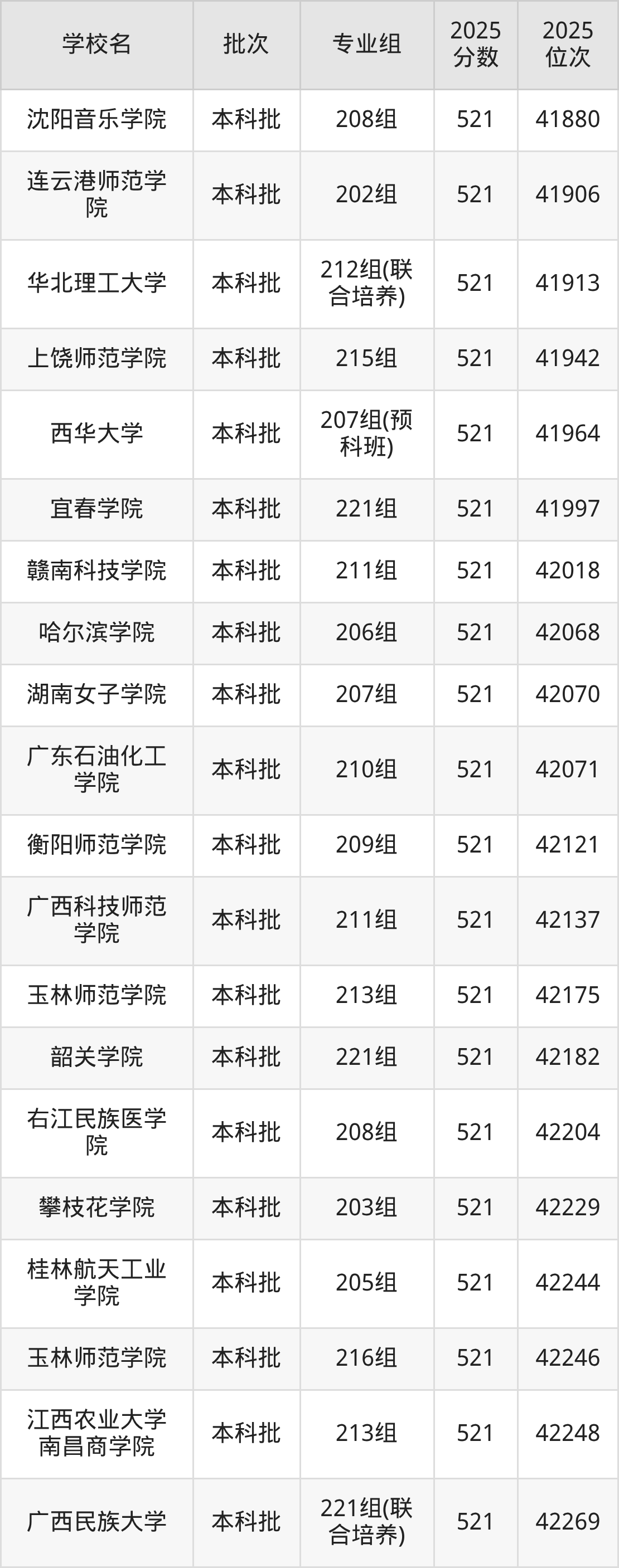 2025年广东高考历史类521分(41754名~42414名)能上的大学有华北理工大学212组(联合培养)、沈阳音乐学院208组、哈尔滨学院206组、武夷学院205组等。