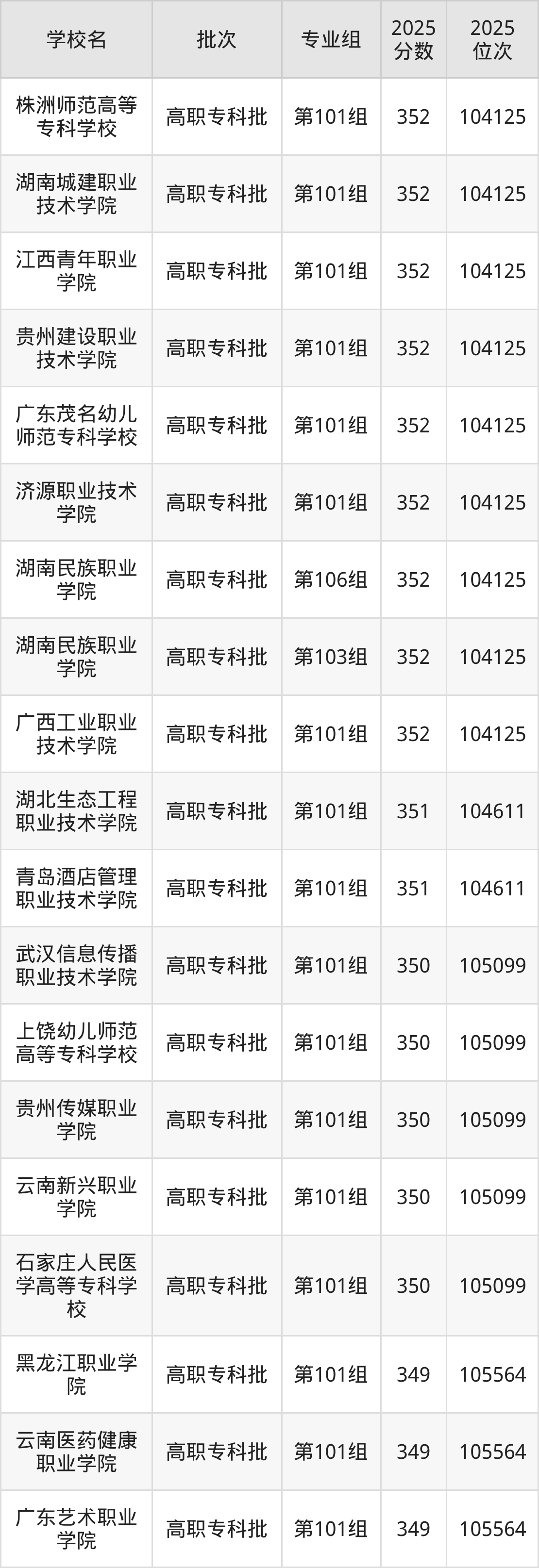 2025年湖南高考历史类350分(104612名~105099名)能上的大学有石家庄人民医学高等专科学校第101组、上饶幼儿师范高等专科学校第101组、武汉信息传播职业技术学院第101组、贵州传媒职业学院第101组等。