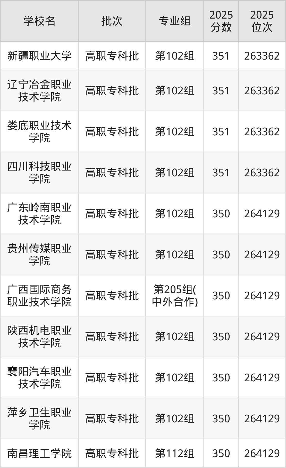 2025年湖南高考物理类350分(263363名~264129名)能上的大学有南昌理工学院第112组、萍乡卫生职业学院第102组、襄阳汽车职业技术学院第102组、广东岭南职业技术学院第102组等。