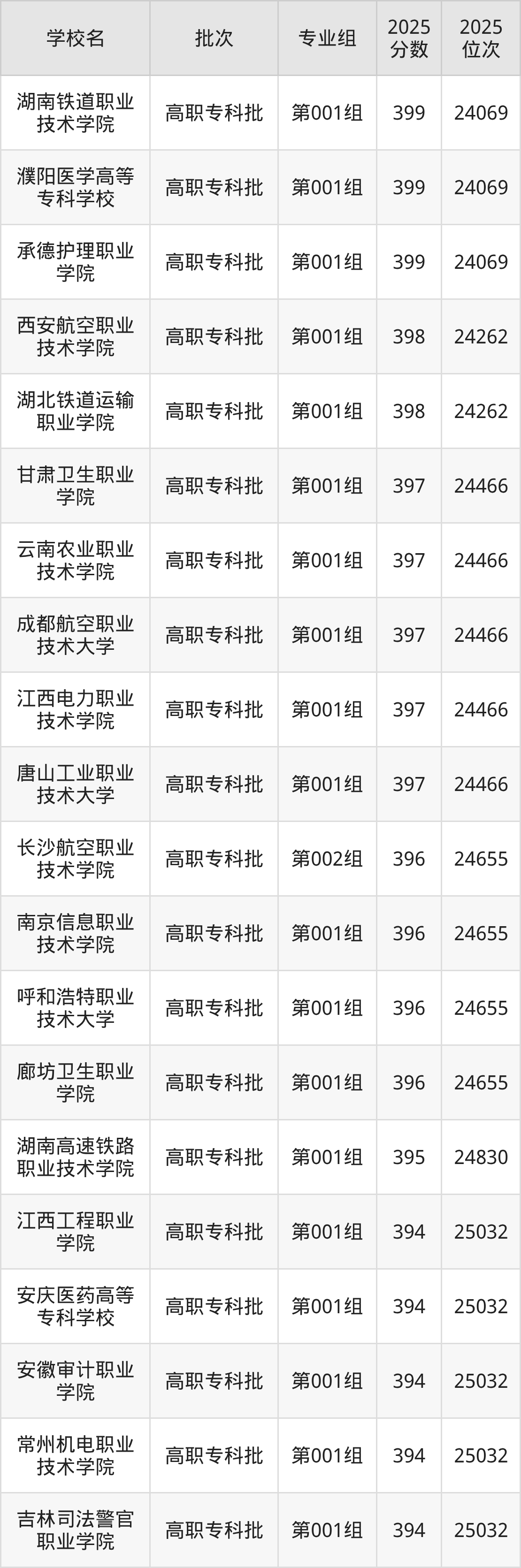 2025年黑龙江高考历史类396分(24467名~24655名)能上的大学有廊坊卫生职业学院第001组、呼和浩特职业技术大学第001组、南京信息职业技术学院第001组、长沙航空职业技术学院第002组。